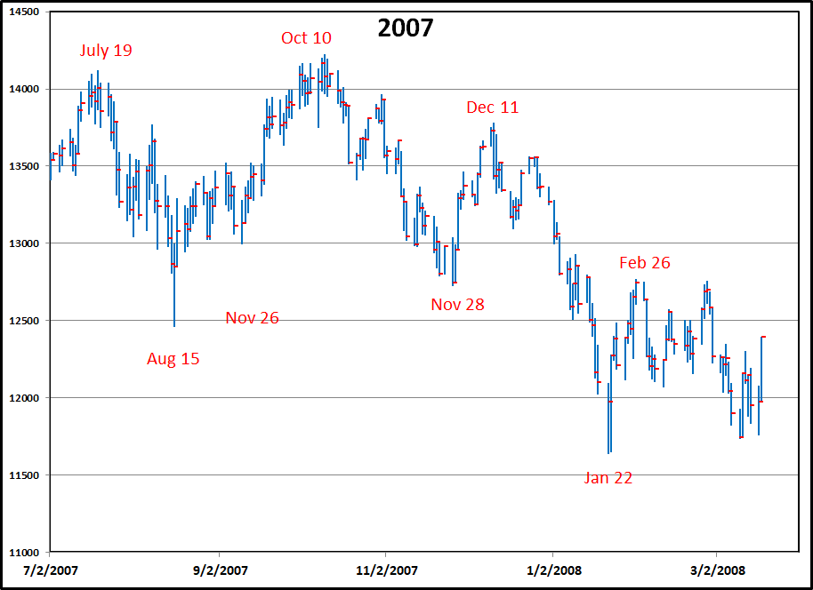 To the rightt is the 2007-2008 stock market. I included this chart in most of my recent updates because the price inflection points this year are coming around the same days as the ones in 2007. In early 2008, stocks fell into late January. Similarities in markets do not mean that the same thing "has to happen." How many articles start off with - "On Friday the market did something that led to gains 90% of the time in the past!" The availability of cheap cloud computing makes comparisons with previous markets and identification of seasonal patterns more available and popular. You can ask AI to identify the five periods that most closely track the last four months of trading and within an instant you have the results and can see what took place in the next month.