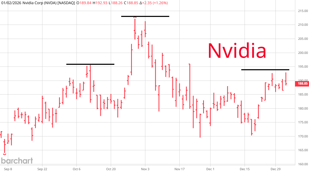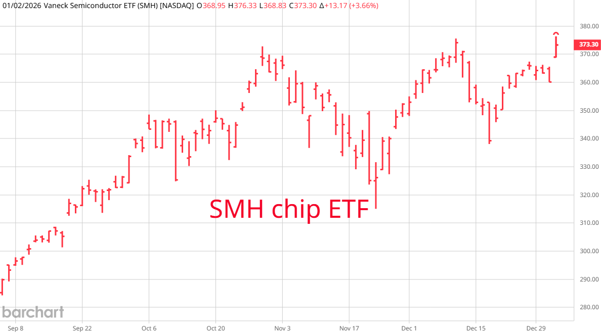 Prices for memory chips have been soaring this year. On Friday, an investor conference with Samsung highlighted this and memory chip makers gapped up at the opening, pushing SMH, the chip ETF to new highs. In past memory chip cycles, persistent price increases caused users to buy extra inventory to avoid future price increases. This resulted in fears of a shortage and even more buying and price hikes until, at some point, users realized that they had enough inventory. At that point, prices fell quickly. The blame for current demand goes to the build out of data centers. In past updates I warned that the current data center technology that uses exorbitant amounts of electricity and needs unrealistic amounts of clean water for cooling, is likely to be replaced. I mentioned competing wafers from Cerberus and Google's new TPU semiconductors that use much less electricity, water and space. On Friday, December 26th, Nvidia took over a chip design company Groq that is designing their own TPU type chip. It uses a fraction of the electricity and water that Nvidia's Blackwell based data centers will use and half the copper. Nvidia rallied last week on reports that Chinese companies are anxious to buy their H200 chips but the Chinese government has not approved these and just (Dec. 12th) introduced their own 70 billion Dollar plan to subsidies their domestic chip industry. I didn't hear a lot of commentary on the Groq transaction but it is immensely important. The more efficient chips are supposed to be available by 2027. If you are constructing a data center, do you build it with the current technology or wait for a year to build one with a fraction of the land and expenses for power, cooling and copper and with processors that are faster than the technology available today from Nvidia? Two years from now, data centers built with the old technology will be at a massive cost and performance disadvantage to those who wait. I was surprised that none of the analysts on TV were talking about this last week. Nvidia boasts a 45% profit margin on its current chips. When car dealers come out with new models for next year, how do they entice buyers to clear out their existing inventory? They cut prices. Given the new, much more efficient technology in the near future, how many data center plans will be quietly postponed? What does it mean for the future demand for copper, cooling equipment and everything else based on current data center design. When 2027 comes, there will be even more improvements that will need less energy, cooling and materials. The history of technology is that it is deflationary. Next year's innovation turns today's new products into relics.