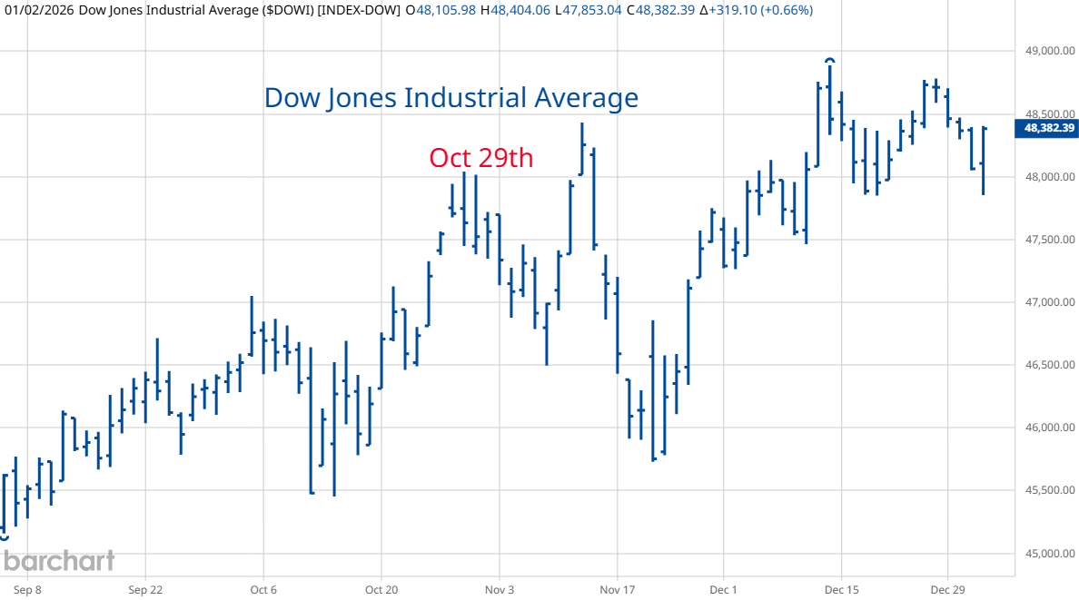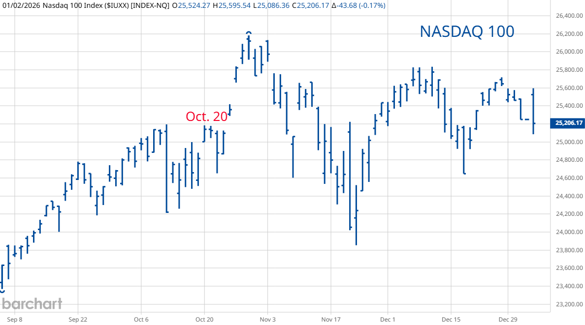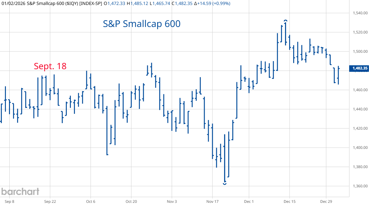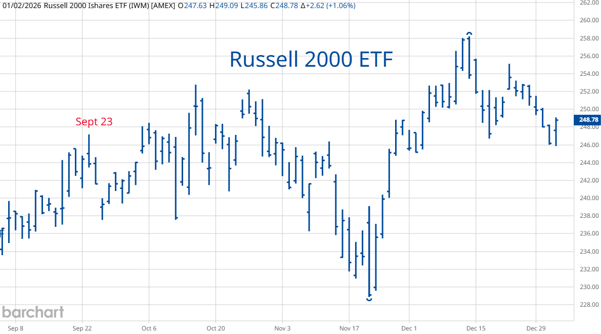 The NASDAQ 100 closed right around its high from Oct. 20th. The Russell 2000 hit a low on Friday morning that was within the range of where it traded on September 23rd. A lot of strategists are predicting a rotation away from the tech sector with the smaller, Russell 2000 companies doing better. It might happen in 2026 but has not happened yet.