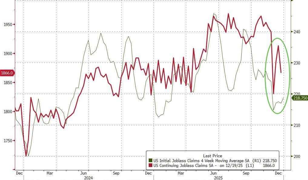 On the left is the latest for New Claims for Unemployment Benefits. The green line is the seasonally adjusted number. The blue line shows the unadjusted data. Analysts pay attention to the seasonally adjusted data. It came in at 199,000, a very low reading. Unadjusted New Claims were 270,000. Continuing Claims (red line, right side graph) fell to 1,866,000. January numbers will better reflect what is going on with jobs.