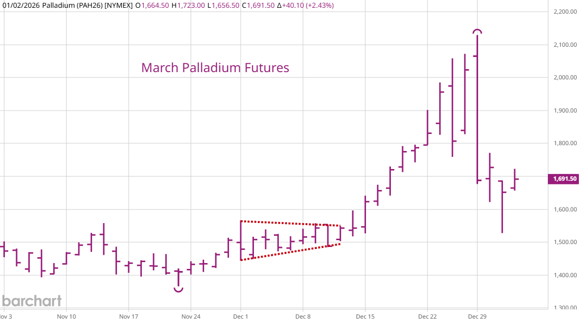 I like to think that platinum and palladium are things in themselves but they continue to follow gold on a daily basis. Last year I warned users to buy when no one cared about these metals. Mines were cutting back production due to low prices. On the demand side there were no new technologies that required much more of these metals that are primarily used for pollution control via catalytic converters and modifying hydrocarbon molecules in chemical reactions. In both cases, there is a high recycling rate. With spikes in prices, it is likely that mining companies are selling future contracts to allow them to ramp up production.