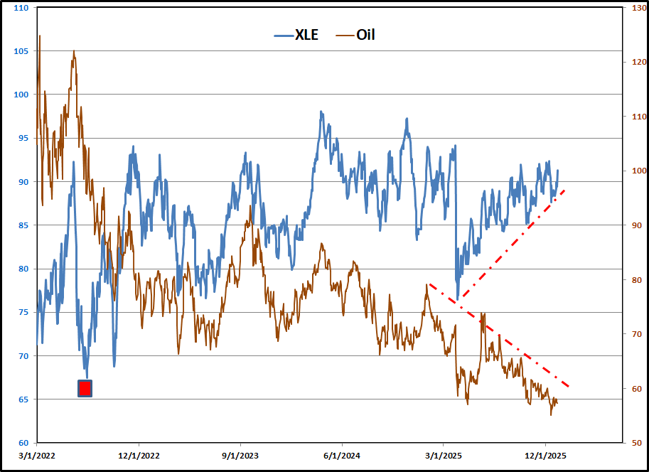 With regime change in Venezuela, what will happen to energy prices? Will we see a sell-off on Sunday night or will markets believe that more Venezuelan oil is already priced in to the market? Ukraine and Russia seem close to some kind of agreement. Will more Russian energy flow to the rest of the world within a few months? The upper right graph shows XLE, the big energy company ETF and the price of oil. I did not adjust the price graph for the recent 2 for one split in XLE. The red square marks a price point for XLE when oil was trading in the 90s. How are lower energy prices good for oil companies? Some of the majors might eventually make money by investing in Venezuela but they will have to spend billions of Dollars to upgrade the infrastructure. Every hedge-fund manager I hear interviewed recommends energy as the next big play. This might be tested next week.