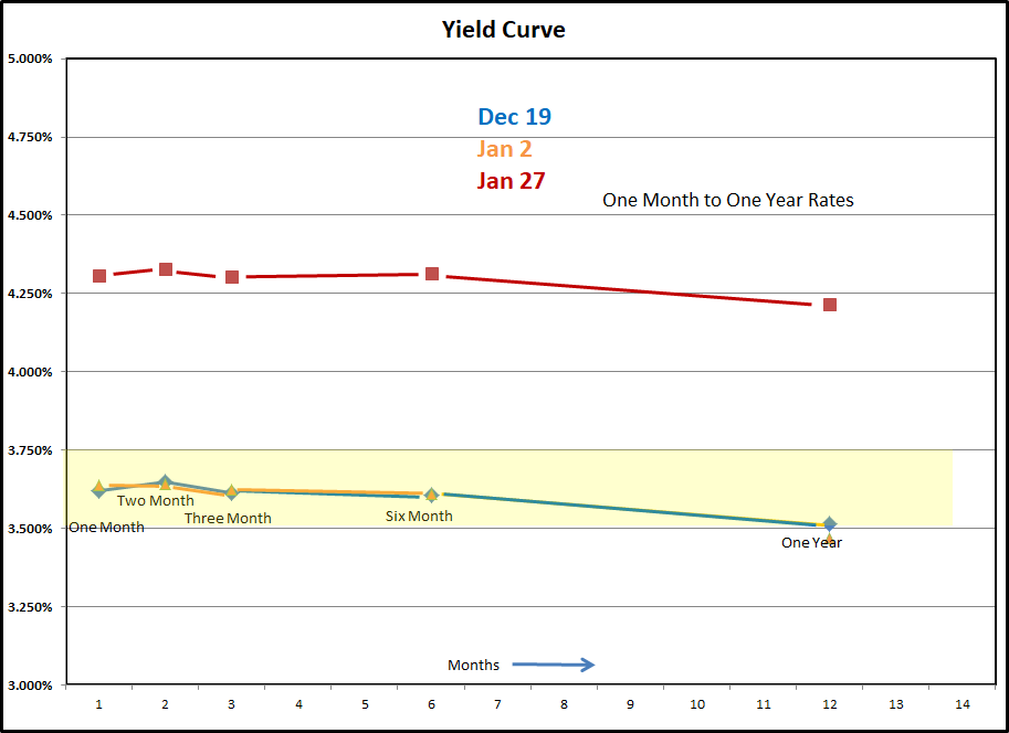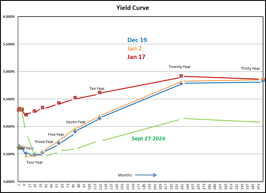 Above are the U.S. government debt yield curves. The orange line is this week's close. The left side graph shows the short end along with the target range of Fed Funds in yellow. The right side shows the longer end. Interest rates after two years in duration are higher. In the financial press there are questions about just why the Fed lowered rates in December. If we get a big increase in New Claims for Unemployment Benefits, the narrative will flip toward more rate cuts.