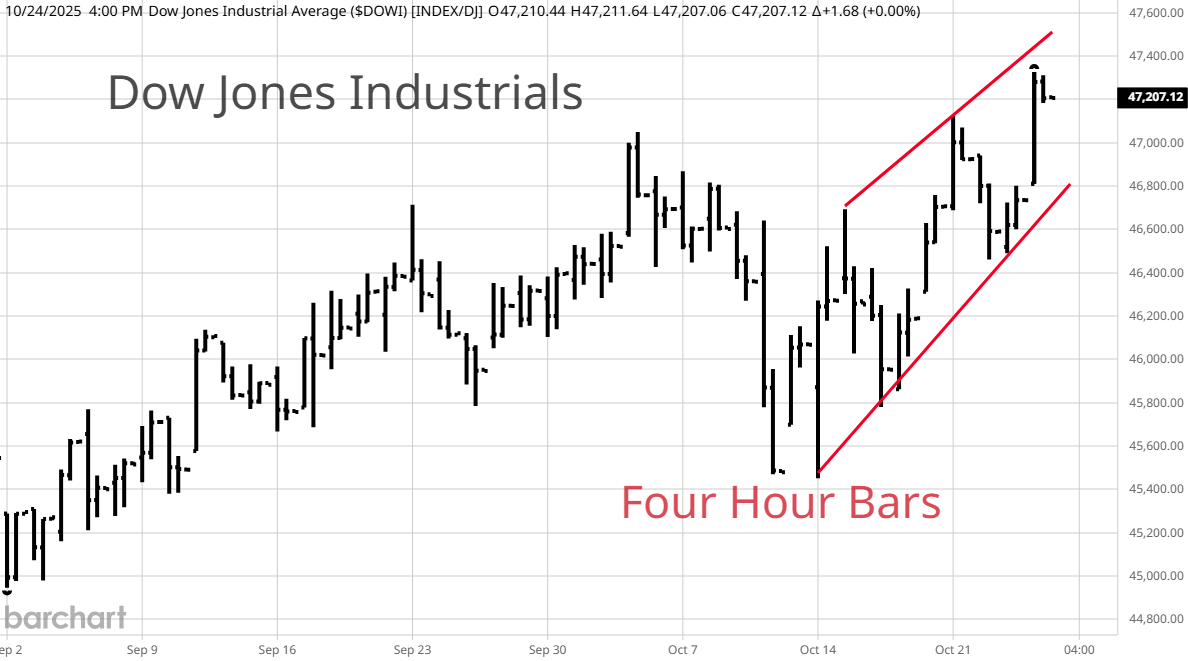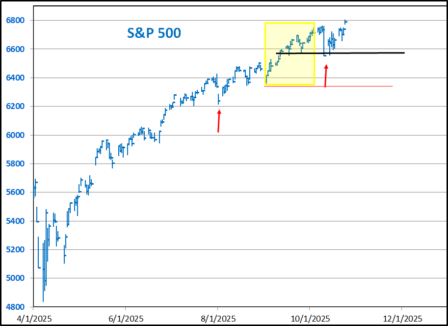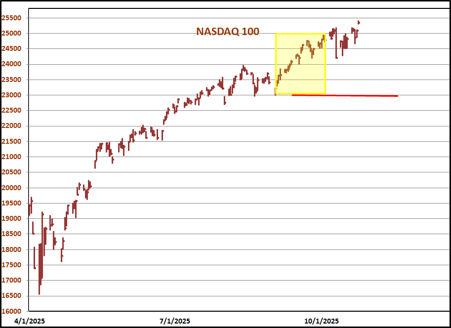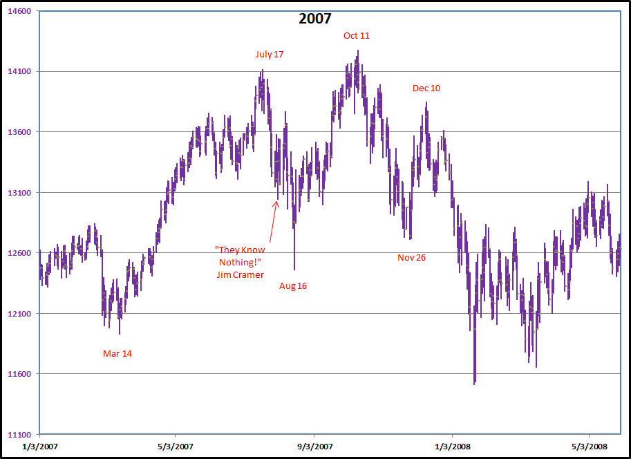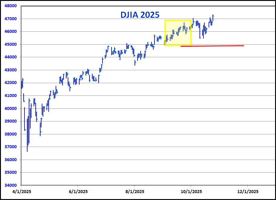 On the left is a "seasonality" graph for SPY, the S&P 500 ETF. This one is from Sentimentrader.com. This graph is everywhere with the assumption that starting this week, stocks have to rally into December because everyone knows that they do this every year. Back in September I heard many analysts say that seasonality called for a pull back into October and that everyone should buy the dip for a year end rally. If you knew something was going up in value starting the last week in October, wouldn't you buy ahead of time? Old timers often said that when a technical indicator becomes widely known, it loses its effectiveness. We will see if this is the case in 2025. On the right is a graph of the Dow Jones Industrials from 2007. During the summer of that year, there were reports from bond traders that there was a problem with the billions of Dollars worth of mortgage derivatives and markets were freezing up. That is what prompted the famous Jim Cramer "They Know Nothing" rant after the Fed said the problems were isolated. Recently we saw some big bankruptcies and loan write-offs with rumors of more to come. In 2007, the "seasonals" didn't work out that well. We are in a very different environment today. Computerization allows transaction free trading for a very small number of shares and the popularity of apps on phones creates an army of millions of inexperienced traders whose small orders are instantly pooled and executed. Added to this is the abundance of leveraged trading products referred to above. The normal band on market extremes has widened along with expectations of constantly making money. By the time I do my next update we will know if the "seasonals" kicked in as anticipated or if the positive seasonal window has become like the shares of a tech stock where traders buy in front of a good earnings announcement then sell on the news.
