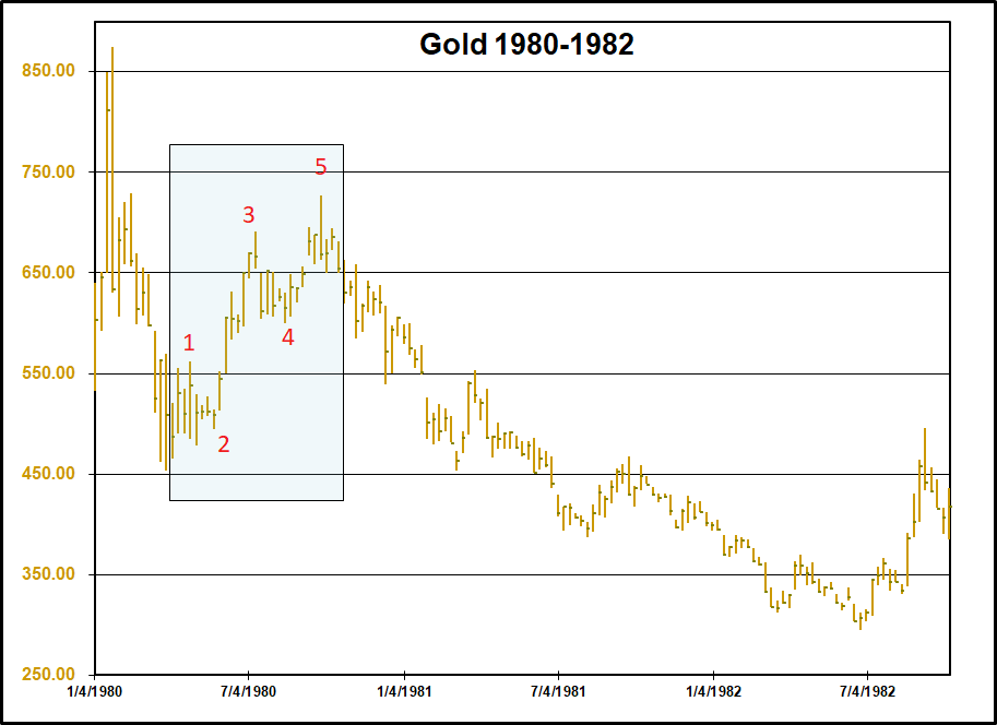 In a perfect chart-book world, the future of gold would look something like the left side graph. The assumption would be that gold is making a five wave advance following a contracting triangle. The strongest part of the rally would be a five wave move unto itself. We just saw the end of the third wave of the extended third wave. The current setback is the fourth of the third that will be followed by another up leg then a larger correction before a final high. (confusing stuff) On the right is a weekly graph of gold prices following the 1980 blow-off. Everyone thought it would correct then hit new highs. Instead, it corrected then rallied in a five wave truncated pattern that failed to make new highs and the rest is history. When a market captures the trading world's imagination, the reasons for owning it become more compelling as it gets more expensive. Near the end, single phrase justifications capture buyers such as "rejection of fiat money."