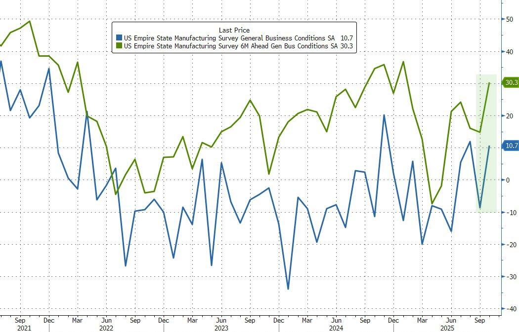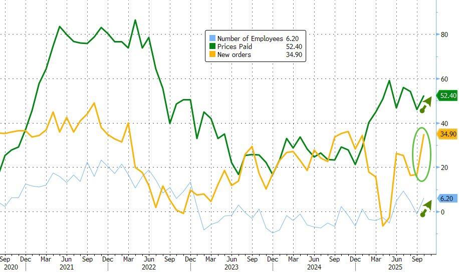 The regional Empire State Manufacturers Survey was very positive (left) with respondents saying things are improving. New orders were up and employment was up slightly. Their prices paid index also rose.