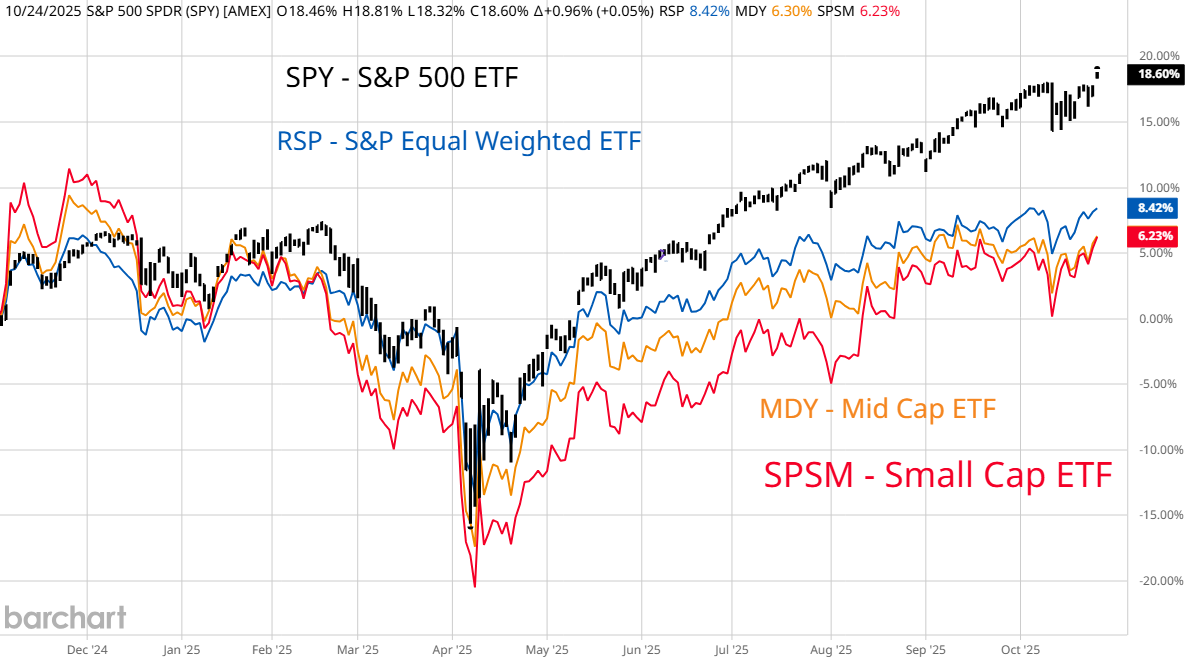 You can see the influence of a small number of AI stocks in two ways. The left side graph shows the path of some popular SPDR Industry ETFs. The XLK Technology EFT is beating them all, including Industrials that are benefiting from AI as infrastructure plays. The right side graph shows different market capitalization sectors. The capitalization weighted S&P 500 is the clear winner due to the weighting of AI heavyweights. Analysts tell us that the rally is "spreading out" but other industry groups and parts of the market that don't include AI specific companies look they are losing steam relative to AI. A Sentimentrader.com article, available to subscribers said that within XLE, more and more stocks are diverging from the fewer heavyweight leaders and that corporate insiders in XLE companies are big sellers of their own shares. If we are "just in the first innings" of the AI revolution then why are the top officers in the companies that will benefit most, cashing out of the future we are told to buy?