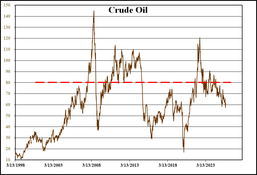 Crude Oil had a nice rally last week after President Trump imposed more sanctions on Russian oil and tried to stop India and China from buying it. The theory is that if you take Russian oil off of the market, all other oil will be worth more. On the upper right is a 27 year graph of crude oil prices. The mid point is around $80 a barrel. What is most remarkable is that after all the turmoil in the middle east and economic expansion that took place over the last quarter of a century, oil is still as cheap as it is. Governments should be thanking the oil industry for doing such a good job of finding new reserves and unlocking the full potential of existing basins. Crude Oil inventories in the U.S., aside from the Strategic Reserve, are around 4% below the five year average for this time of the year. Gasoline is about even with the five year and distillates are 7% below. Lately, I have been reading the work of self titled futurists who say that crude oil is about to make an historic price surge. They claim that buying things in the energy patch today is like buying gold at $500. They might be right. I also know that every dog has its day and that recommending out of favor things sometimes pays off. When it happens, those who told you to buy look smart when they were simply lucky.