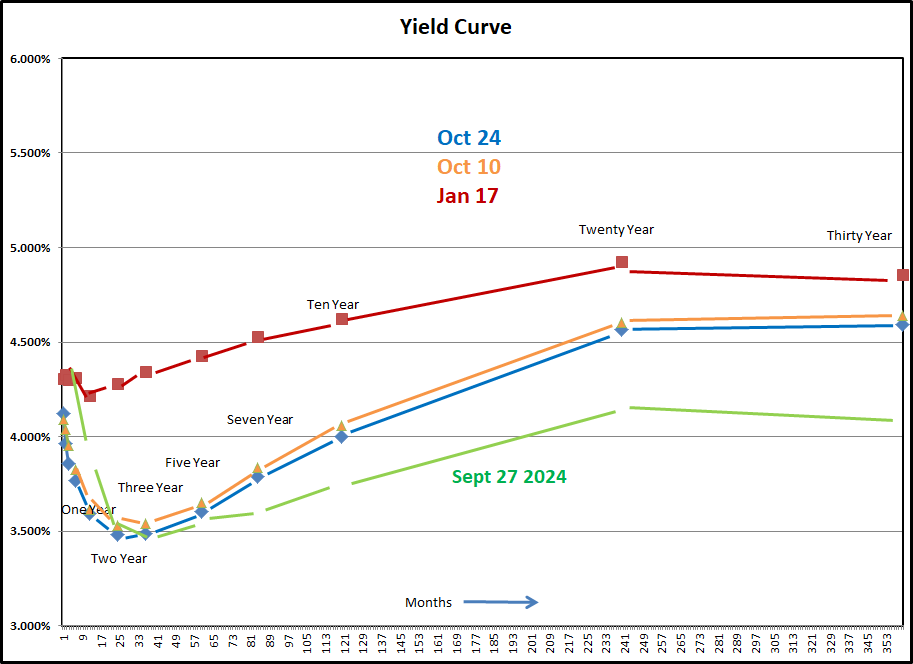 Interest rates fell after the CPI data with analysts convinced that the Fed is in an interest rate lowering cycle despite inflation hovering above their 2% target. The upper left side graph shows the very short end of the curve where most of the rate change is taking place because the Fed cuts are on overnight lending rates to banks. The farther out you go on the curve, the more you have to worry about what will happen in an unpredictable future. Rates on the shorter end of the curve finally fell below the level they hit after the first Fed cut in September of 2024. Longer term rates are above the initial rate cut levels.