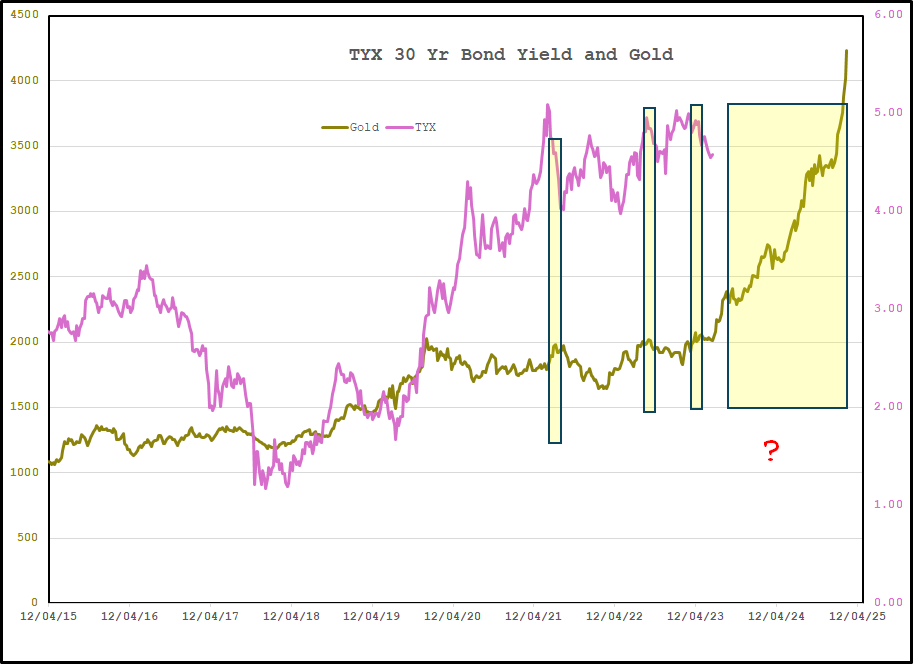 Among his charts was one showing that long term interest rates tend to follow gold with a 20 and a half month lag and that based on this, he anticipated that long term rates were about to skyrocket! This goes against everything most analysts are predicting. I decided to build my own graph using end of week prices. The purple line is TYX which tracks the rate on a 30 Year Treasury Bond. The greenish line is the weekly closing price of spot gold in NY. I inserted the yellow bars at the recent little peaks in gold before it took off.