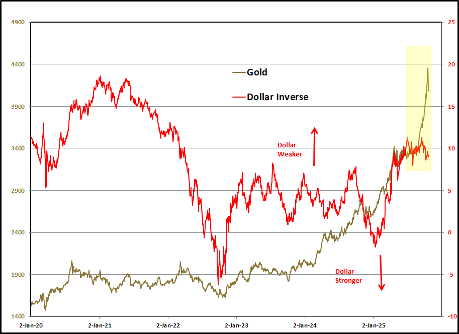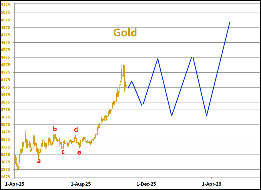 On the left is the recent path of the U.S. Dollar Index. The series of a,b,c zig zags makes the formation look like a correction before another sell off. As a trader, I assumed that these types of patterns were setups for lower prices in other markets. When they broke to the upside instead, the rally was substantial. Trying to guess the outcome of a sideways pattern can be hazardous. Cyclesman.com, my favorite subscription service, says that the Dollar is due for a four year cycle low! On the right is a picture of the Dollar Index inverted. When the red line goes down, the Dollar is going up relative to other currencies. Usually, a stronger Dollar hurts gold. Another Dollar drop will fuel the "rejection of fiat currencies" narrative