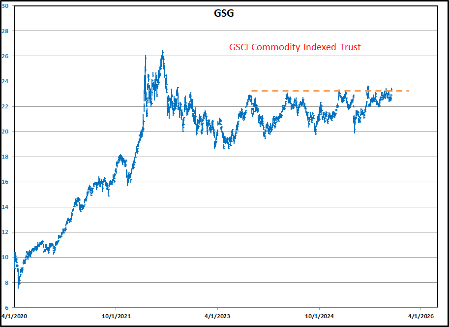 DBC and GSG are both broad based commodity ETFs. DBC is tilted more toward grains and GSG toward energy. There are analysts saying we are in a commodities super-cycle and a 15 year period where commodities outperform stocks. Bulls see the long sideways trading as a base for a big upside move. If they break to the downside instead, the same analysts will modify their charts to say that the sideways move was a pause before a deflationary trend.