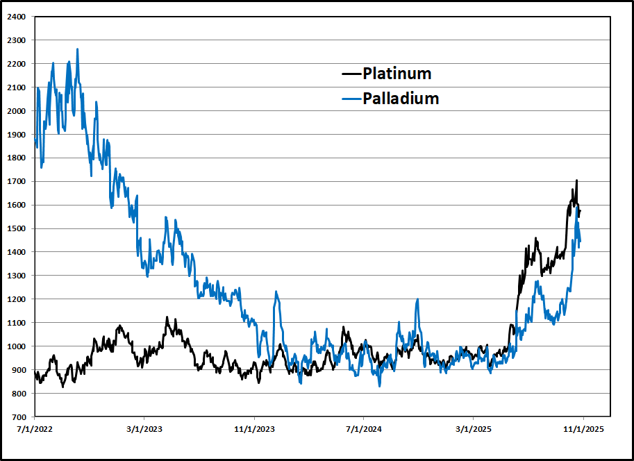 The left side graph shows the daily closing spot price of platinum and palladium in NY. They pulled back with gold and silver. In many of these updates last year I advised those who needed the metal to buy while the markets were boring. If gold and silver fade, these metals will likely do the same unless social unrest rises in S Africa or Ukraine drones the Nornickel mining complex in Siberia that produces 40% of the world's palladium and 10% of its platinum. On the right is a weekly bar chart of copper. Despite all the predictions of much higher prices it is not that much better off than it was four years ago!