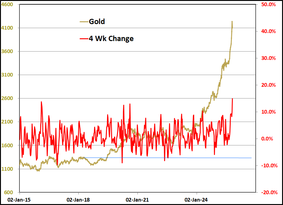 When will gold be investable again? The bulls say, "right now." Above are oscillators on the weekly closing price of gold in NY. On the left is a simple 4 week rate of change measurement. Even with the pullback, the rate of change oscillator is near the high of its 10 year history. The right side graph shows a simple RSI momentum oscillator which is still above 0.80. If you knew nothing about all the theories around why gold "has to" go higher and simply glanced at these graphs, would you be in a rush to buy on Monday?