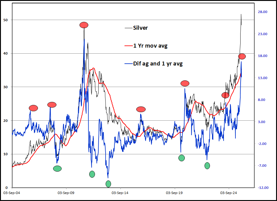 Two weeks ago, every commentator loved gold and silver. Fans of silver began predicting future prices in the $75 to $100 range. On the right, is my Silver vs its 1 Year Moving Average chart. It is still in red dot territory. The current red dot sits at the second highest level on the graph.