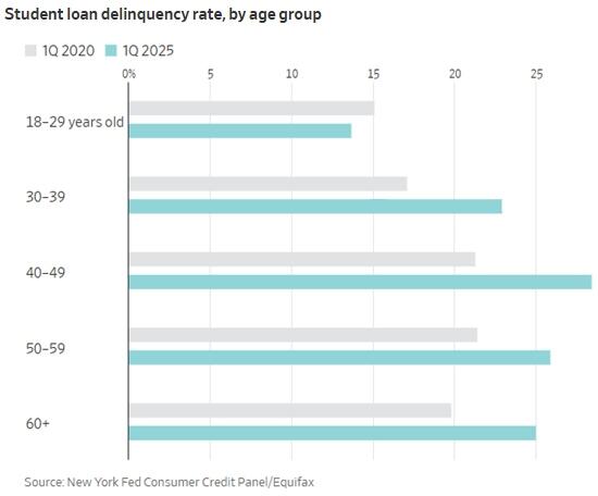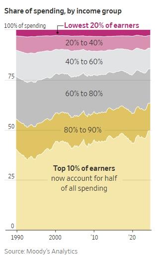 The Fed released statistics on student loan delinquencies. The moratorium ended last month. I was surprised to see that the rate is the highest among middle aged people and older. This graph speaks to the rate of late or non payments. It could be that the balances outstanding for the older groups are a lot smaller than the younger ones. Besides, at 60 plus, what the hell are they really going to do to you for not paying the remainder of your student loan? On the right is a graph showing the make up of groups driving the economy. 70% of the GDP comes from consumer spending and half of that is from the top 20% of earners. This is also the same group that owns most of the assets. You can understand why the Fed and our President are so obsessed with keeping the stock market and real estate prices elevated. Most wealthy people have a three legged stool kind of approach to spending money. The know that their job could be in doubt because of structural changes like AI but as long as their homes keep going up in value or at least, not going down and as long as their investment portfolio is doing OK, they will keep buying stuff. It is no wonder why you just don't hear stock market skeptics featured in the financial media. Everyone wants to keep the party going.