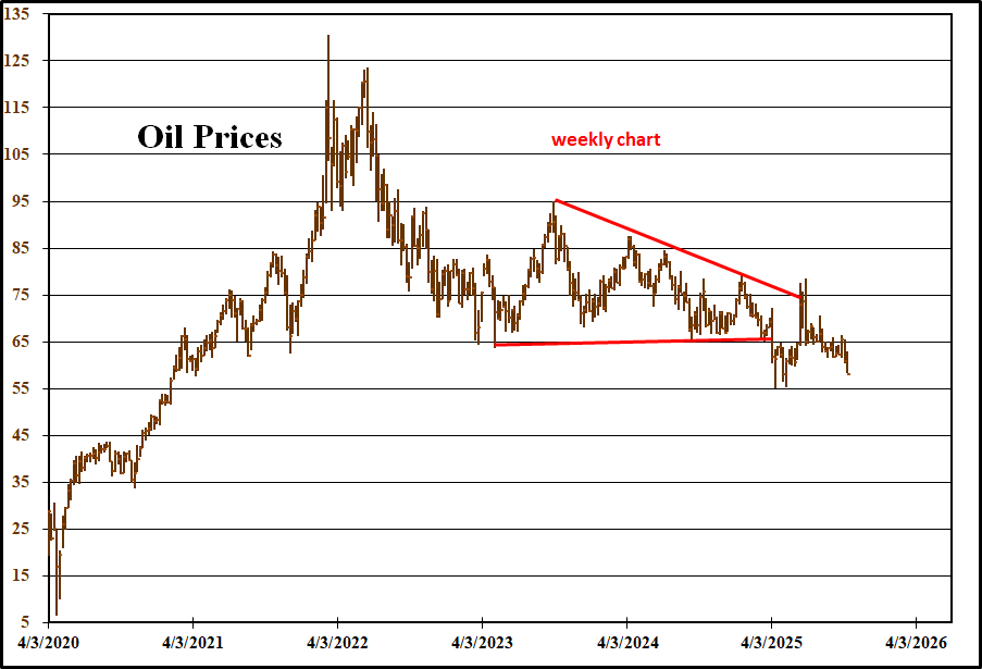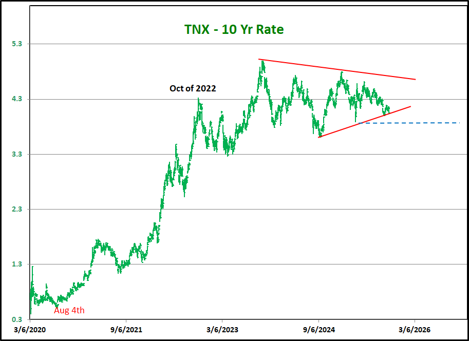 The chart just to the left shows the action following the expanding triangle with the more bullish markings. Cyclesman.com says that there is a four year cycle, from low to low that repeats over and over again. Some cycles run a bit long and others, short. The last cycle low was in October of 2022. The next one is due in 2026. A major indicator of a four year cycle top is a monthly swing high so watch the daily graphs above.