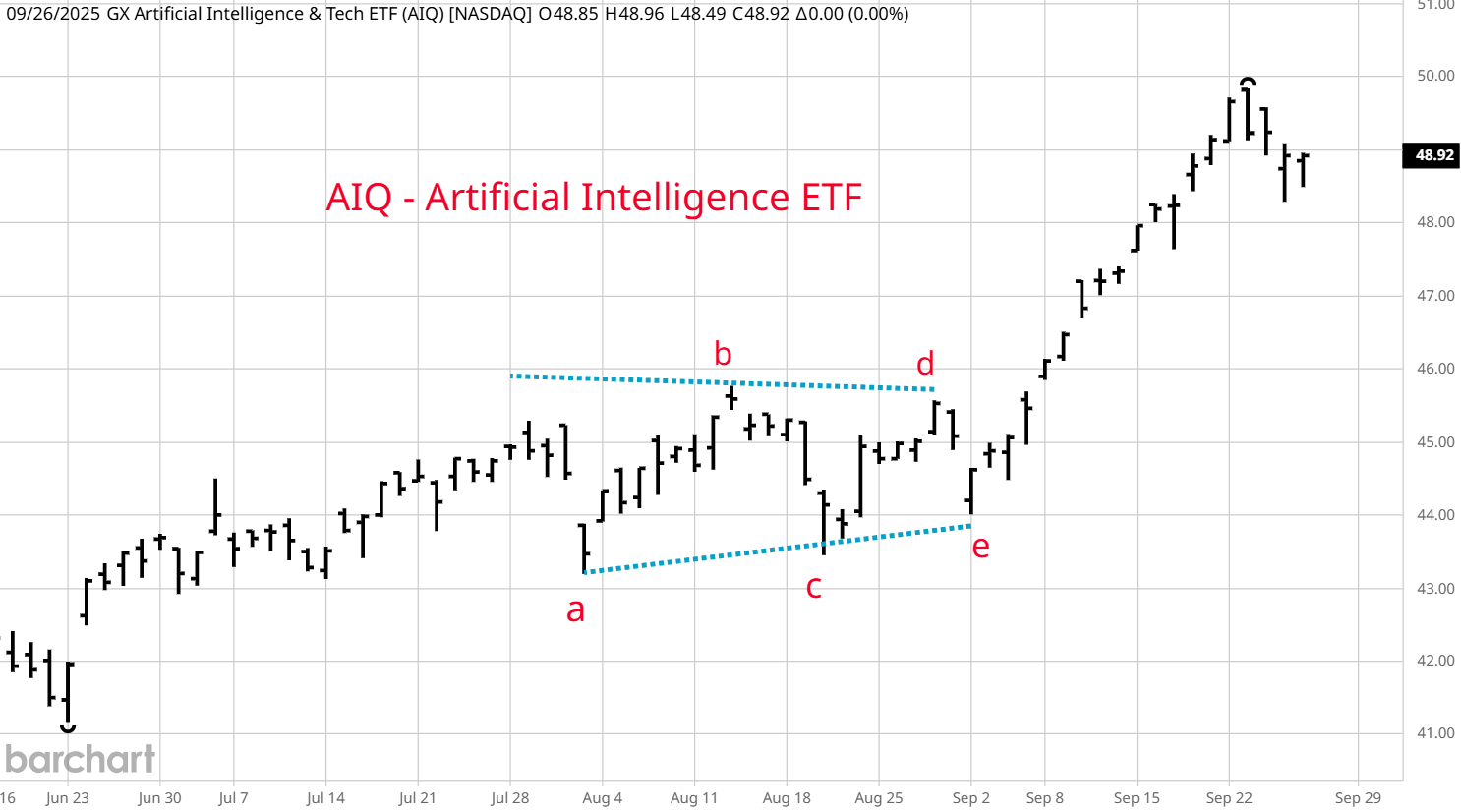 On the left is a graph of platinum futures. I drew lines and a,b,c,d,e around the formation and labeled the subsequent 5 wave rally. Based on this count we should be near the top. On the right is AIQ, an ETF that tracks companies involved in Artificial Intelligence. The triangle correlates well to the middle one on the left from the text book with the high of "b" exceeding the original top. Last week, shares retreated.