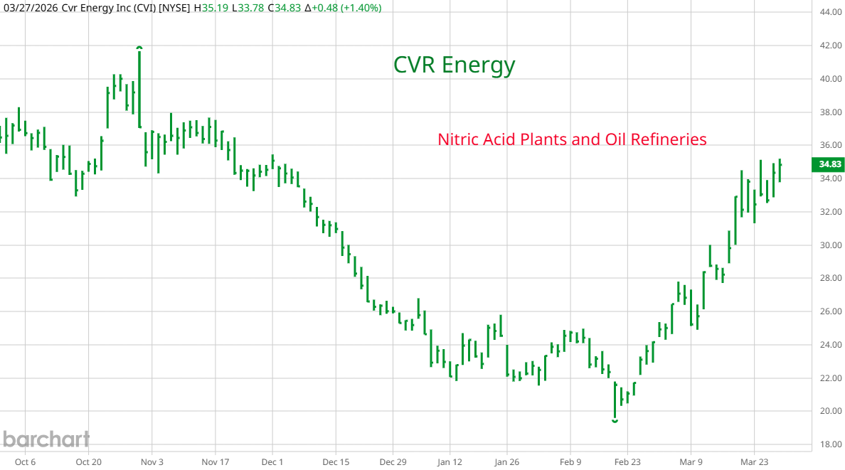 Natural Gas is used to make fertilizer. With Qatar out of business for now, there is a shortage of LNG. Some of the countries that are blockaded also make fertilizer so supplies are limited as we approach planting season in the Northern Hemisphere. Russia is also a supplier and it is likely that sanctions will be removed from their fertilizer. The soils in major agricultural belts are depleted and need fertilizer every year. Investment advisors are telling clients to buy fertilizer companies in N America, crop ETFs and companies in the food supply chain. You can see from the graph of C F Industries and Archer Daniels Midland that the move into this sector has begun. On the upper right is CVR Energy. Aside from two oil refineries and pipelines, they own two nitric acid plants in N. America. Nitric acid is used to make fertilizer. When the gold rally started, I warned that before it was over, anything that could be called precious would join it. Eventually, silver, platinum and palladium rose. If there is no peace and the Straits stay closed, everything going into crops will also catch a bid. With CVR you get it's added exposure to energy. As with everything else that is benefiting from the war, rumors of a deal and a reopening of the Straits will result in a selloff.