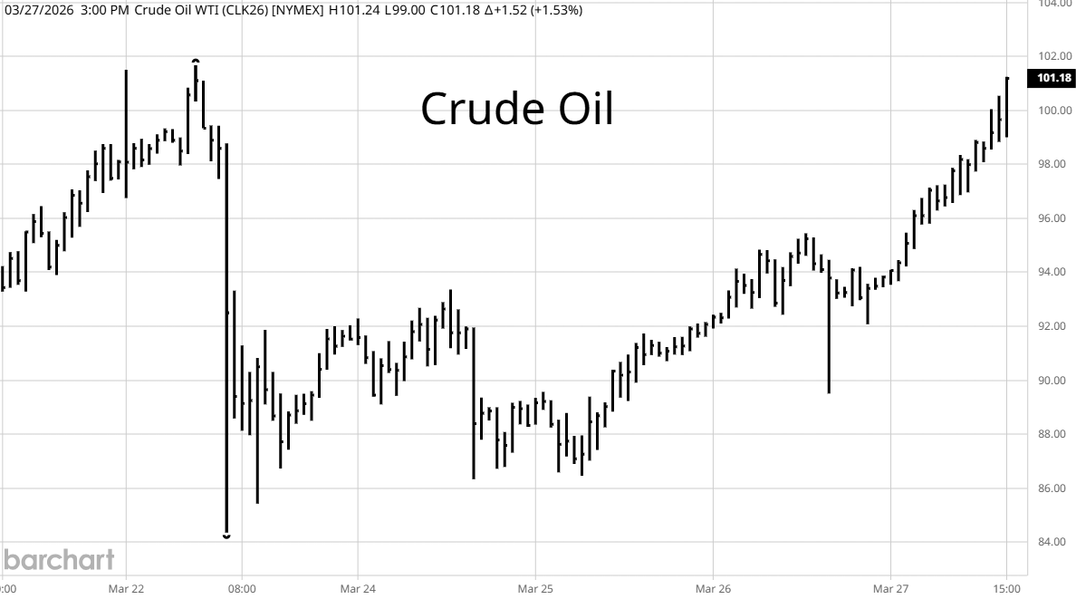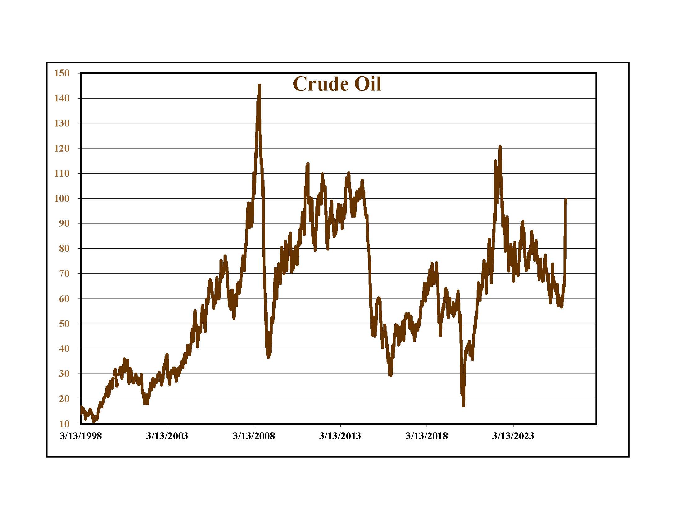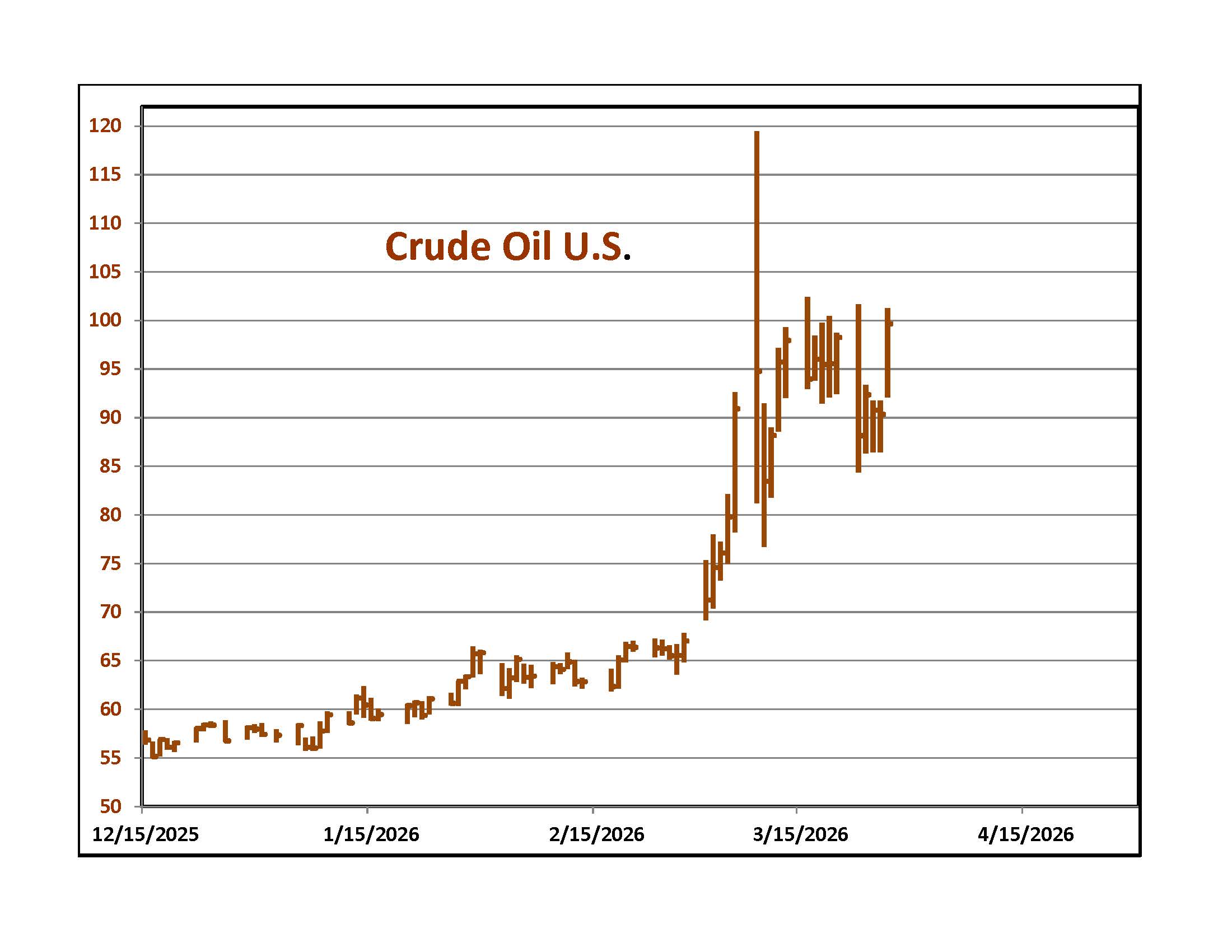 Everyone is watching the price of oil. These graphs show West Texas Intermediate, our domestic contract for different time frames. The upper left chart highlights the recent price increase after we attacked Iran. The upper right graph is from last week. Going into the weekend, traders bought oil, anticipating more attacks on the energy infrastructure of Middle East oil and gas producers. The graph directly to the right goes back to 1998. Oil traded above $100 for a very limited time over the last quarter of a century. While no one wants to be short this market, traders know that if there is any move toward a cease fire and an opening of the Straits, energy prices will fall quickly.
