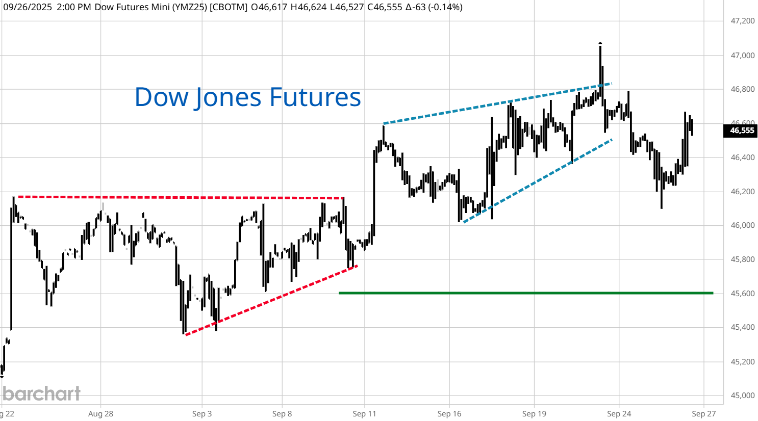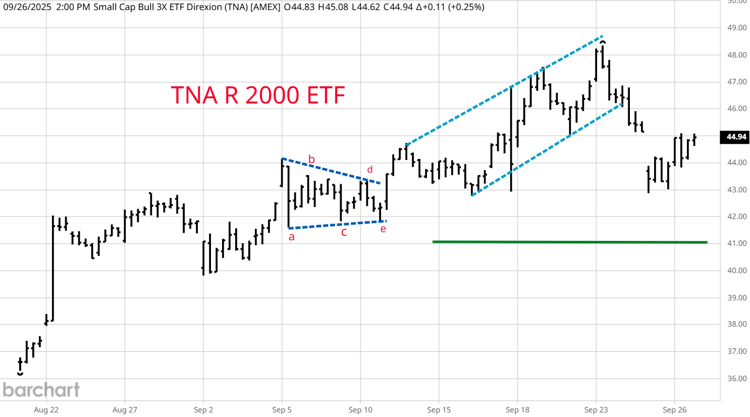 Here are two from last time. On the left is the December Dow Jones futures contract and on the right, an ETF that tracks the Russell 2000. The Dow traced out a series of overlapping moves to a new high. Sometimes this is the sign of a weak market, about to hit the skids. It could also be just the first wave higher followed by a funky correction. If so, then we need to see some good upside action early next week. A break below the green line would look bad. It was the same for the Russell 2000. The move was a bit more vertical but nothing inspiring and we had a large sell-off. If this is just the first leg up with a wave 2 correction before a 3 up, then we need strong follow though to the upside next week. A break of the green line will tilt the odds towards a good sized top.