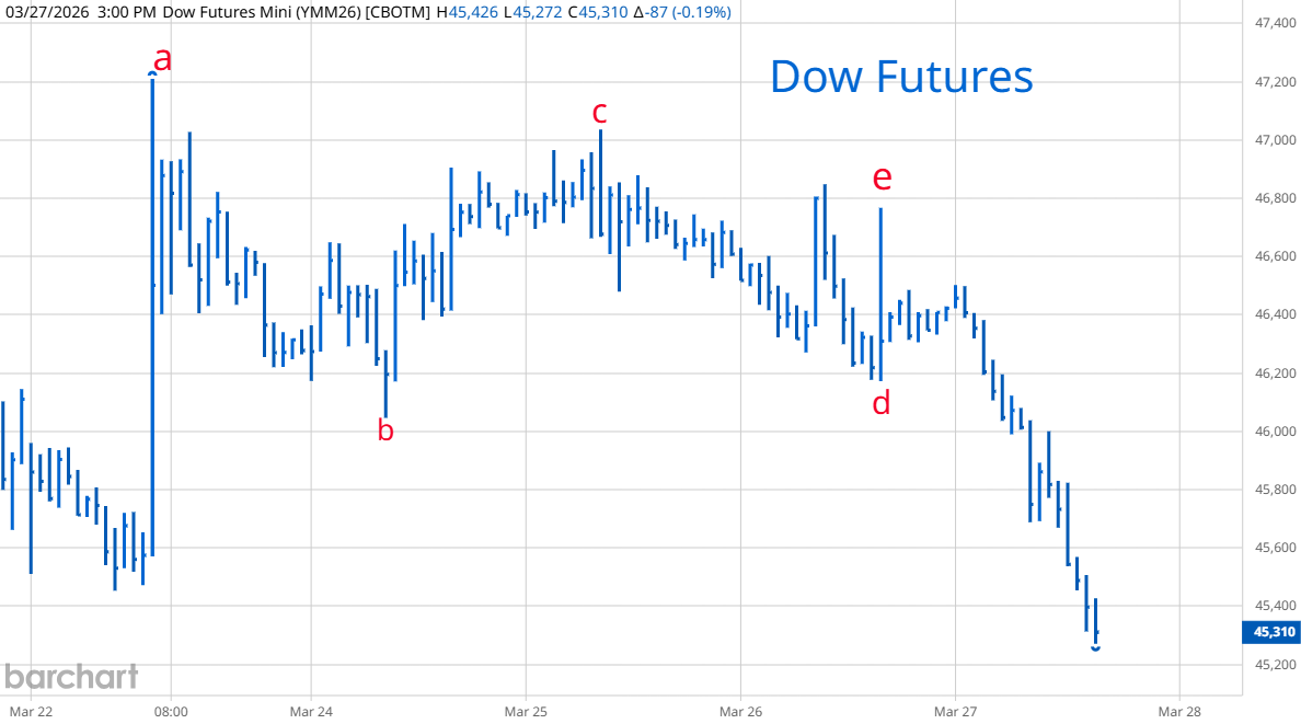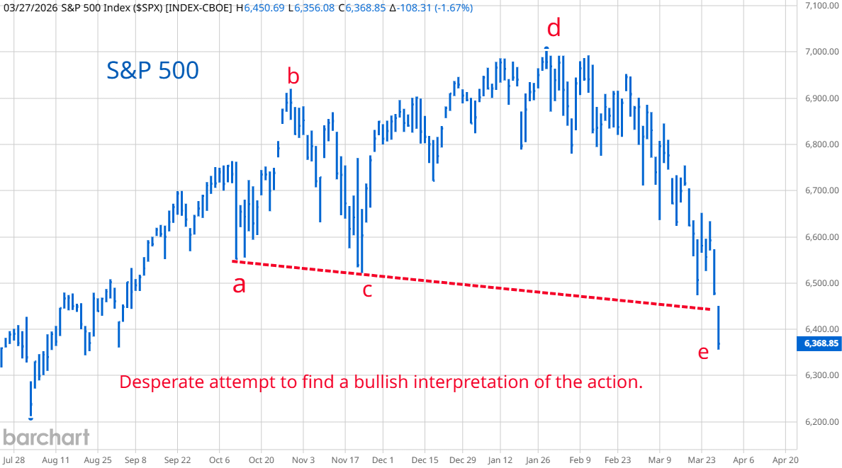 The tech sector continued to get hammered as hedge funds raised cash. Nvidia's price earnings ratio is down to 34.2. There is a worldwide shortage of memory chips because of the data center build out. Memory chip companies were the last place to hide until Google's announcement. It will be a while before these chips are available and deployed so there will likely be a rebound in the chip space. If stocks ever stabilize, the blood bath in tech will make it one of the earliest winners during the rebound. With all the terrible news, I cherry picked charts to find a positive spin on something. On the right is a graph of the S&P 500 with letters labeling all the action since last fall as an expanding triangle pattern (a,b,c,d,e). Most triangles are the contracting type with each subsequent leg shorter than the previous. Expanding triangles are the opposite and are followed by very robust rallies into a final high then a major reversal. I took philosophy and religion courses in college and the important thing I learned is that a clever person can paint a very convincing word picture of events with internal consistency that leads you to believe that right is wrong, criminals are the real victims, your house is on stolen land and the S&P will bottom on Monday then rally to new highs. If the clever person uses proper diction with a lot of words ending in "tion" and "cion" it helps their case and if they are good looking they will always find an audience.