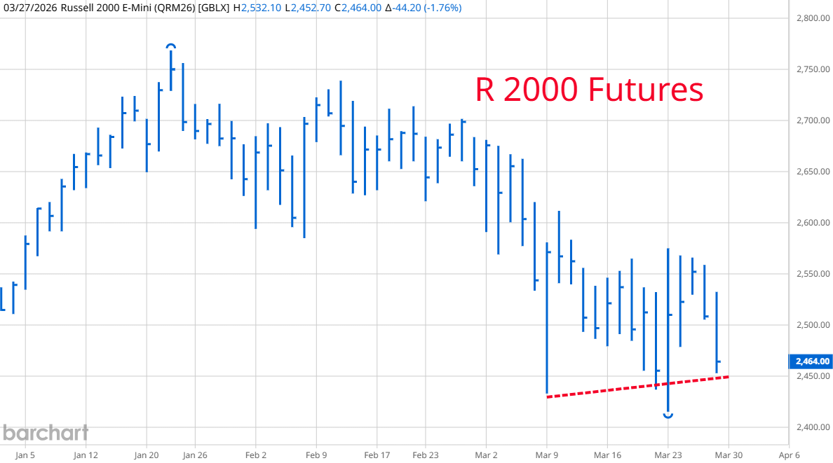 If there is any deescalation, here are two things I am watching. On the left is a graph of Russell 2000 futures. The Russell 2000 is made up of smaller companies. Theoretically, if the world is going into an oil crisis recession, these smaller firms should suffer more than big companies so you would want to avoid them. Our government is on a war footing spending binge in the industrial sector which is helping smaller firms. Also, the "liquidate everything" mentality of hedge funds hurt large companies more than small because that is what they owned. If the news turns positive, the Russell 2000 could shine. On the right is Apple. Due to the selloff, its price earning's ratio is down to 32.34, not bad for a great tech company. It sold off less last week than the major averages. Analysts criticized Apple for not pouring billions of Dollars into its own data centers. Now, most of those data centers look like they will be technologically obsolete within a year or two for reasons stated above and in previous updates. The big AI companies will all be desperate for customers and willing to discount their services to attract the I Phone business. Apple will get the benefits of the technology while not breaking its balance sheet to provide it. Costs incurred will be passed along to its giant customer base. If the world is not destroyed over the next few months, Apple could emerge a big winner.