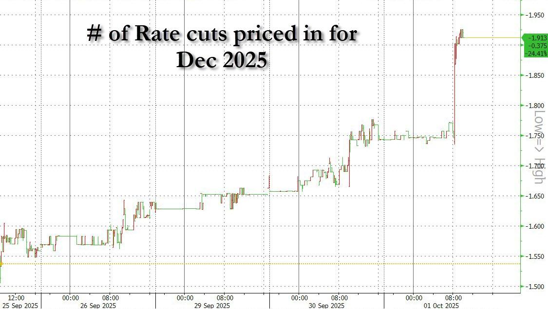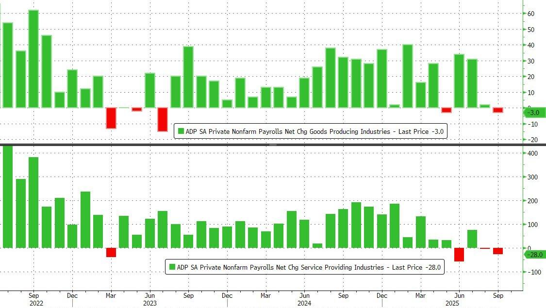 ADP, the huge payrolls processor said we lost 32,000 jobs in September (upper left). There were losses in both goods producing companies and services (upper right). After the report, the odds of a rate cut shot higher (left).
