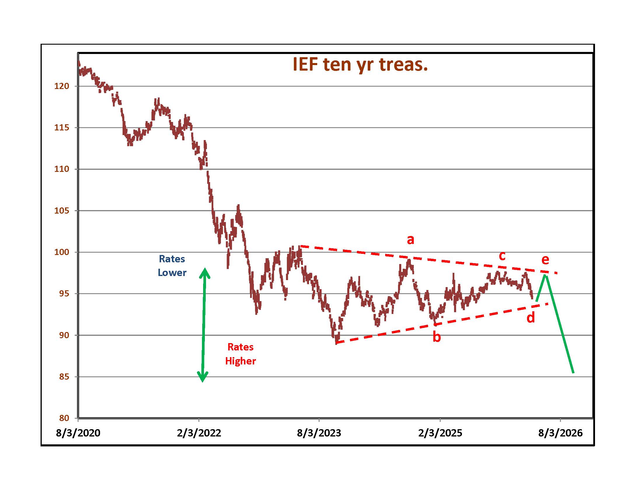 On the left is the latest position of the yield curve on U. S. Government debt. The orange line is the latest. Rates on 20 and 30 year bonds rose above the January 2025 levels. Rates on short dated paper climbed when traders gave up on the Fed lowering rates in a 3% to 4% inflation environment driven by war spending and shortages. As with everything else, talk of peace will result in an immediate reversal. Bonds will soar. On the right is a graph of IEF, an ETF that tracks 7 to 10 year Treasury Notes. One could make the case that it is tracing out a contracting triangle where we are close to the "d" point. The next major move would be a quick, news inspired rally back to "e" before a plunge ( sudden spike in interest rates). IEF would make a significant low (high in rates) and reverse direction. Over the last few years, corporate bonds did better than government bonds. Currently there is a lot of worry about Private Credit. Even though it is Private, many of the funds invested in it also leverage their bets by borrowing from banks and Wall Street institutions. You could see a temporary return to Government Bonds.