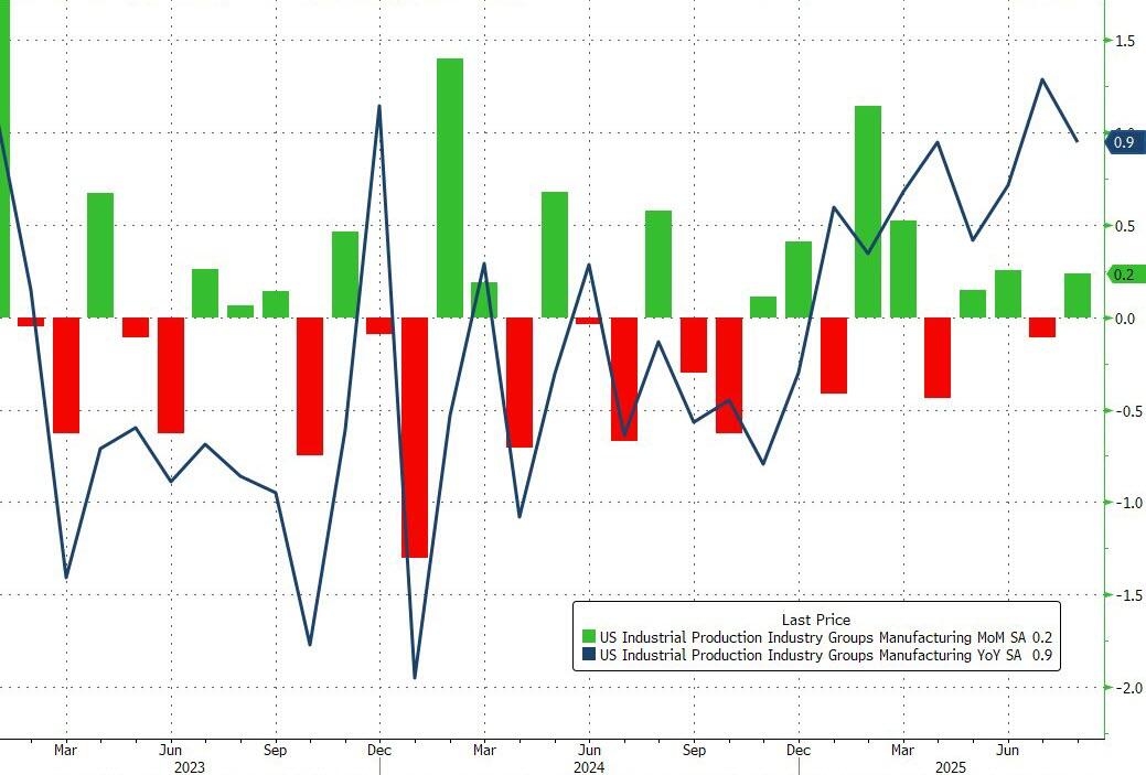 Total Industrial Production (left) rose a small 0.1% with the annual reading falling to 0.9%. The Manufacturing segment (right) was up 0.2% month over month and 0.9% annually. Manufacturing is only 14% to 15% of the economy.