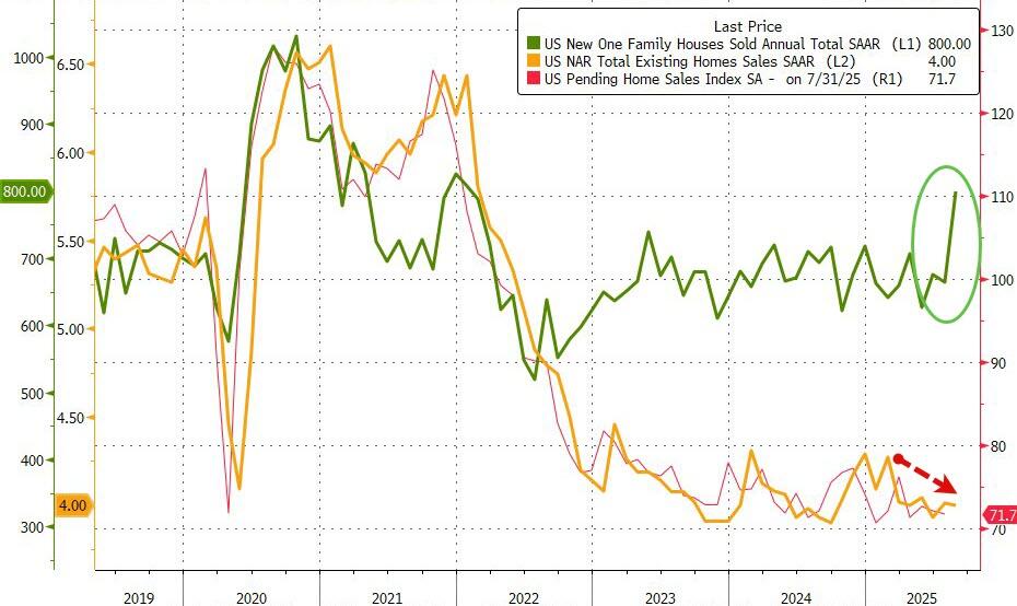 With rates temporarily lower, new single family home sales surged as shown by the green line on the graph to the left. Most of the sales were in the south, aided by generous give aways from home builders. The activity was in very high priced homes. Existing home sales (orange line) were quiet as were pending home sales (red line). The price of existing homes is still above new homes with both rising last month. I heard an analysts on TV say that lower rates would result in lower prices for homes because the differential between existing mortgages and new ones would shrink, making it easier to sell the old and buy the new. If rates fall farther and more people are coming into the market to buy, why would anyone lower the price of their property?