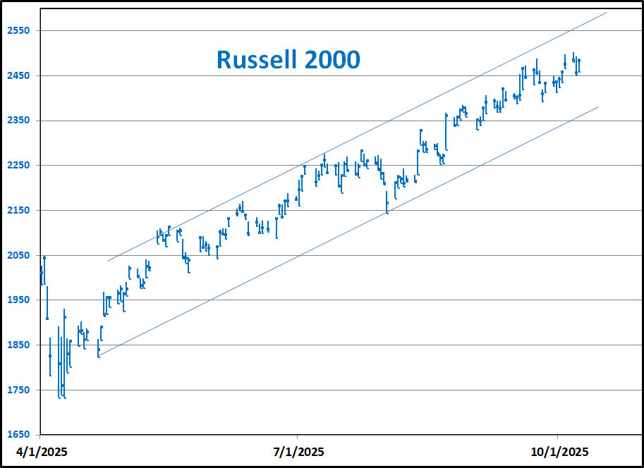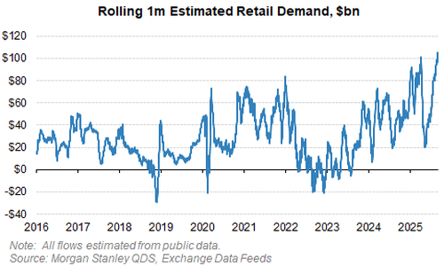 On the left is an MS graph showing just how much money non-professional investors (you and me) are throwing at the stock market. On the right is graph showing the volume of trading in Call Options that speculators buy to take advantage of rising prices. Much of this volume is in one day options that expire at the end of the day. On many mornings the market opens lower then mysteriously recovers, hitting an afternoon high before fading into the close. Many times, this follows the buying impulse of one day options. When a speculator buys them, dealers on the other side hedge their sales buy buying some of the underlying stock. In past markets this had a minor influence on the price of the shares. Now, because of the sheer volume of options trading, the number of shares that dealers have to buy makes a big difference and drives the shares higher. It creates a self fulfilling loop totally unrelated to the fundamentals of the companies. Call buying is most focused on the big tech and AI names.