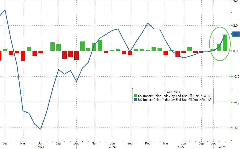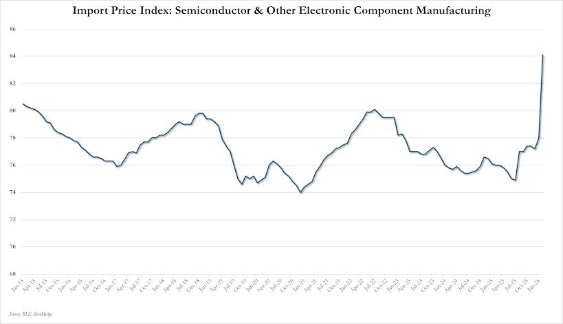 Import prices rose 1.5% month over month. The last green bar on the upper left side graph puts the increase into perspective. Raw materials were up but the biggest contributor was the cost of memory chips (right side) amid a world-wide shortage. Thursday, Google announced that they have a new chip for data centers that will result in a huge increase in efficiency and they won't need all of the memory chips that current data centers require. Prices for memory chips fell on the news and so did the share price of the companies that make them. Regular readers know that I have been warning that we are in the early innings of the data center innovation cycle. Before it is over, not only will there be less need for memory but it is likely that the energy needed will be a fraction of what the current technology requires.