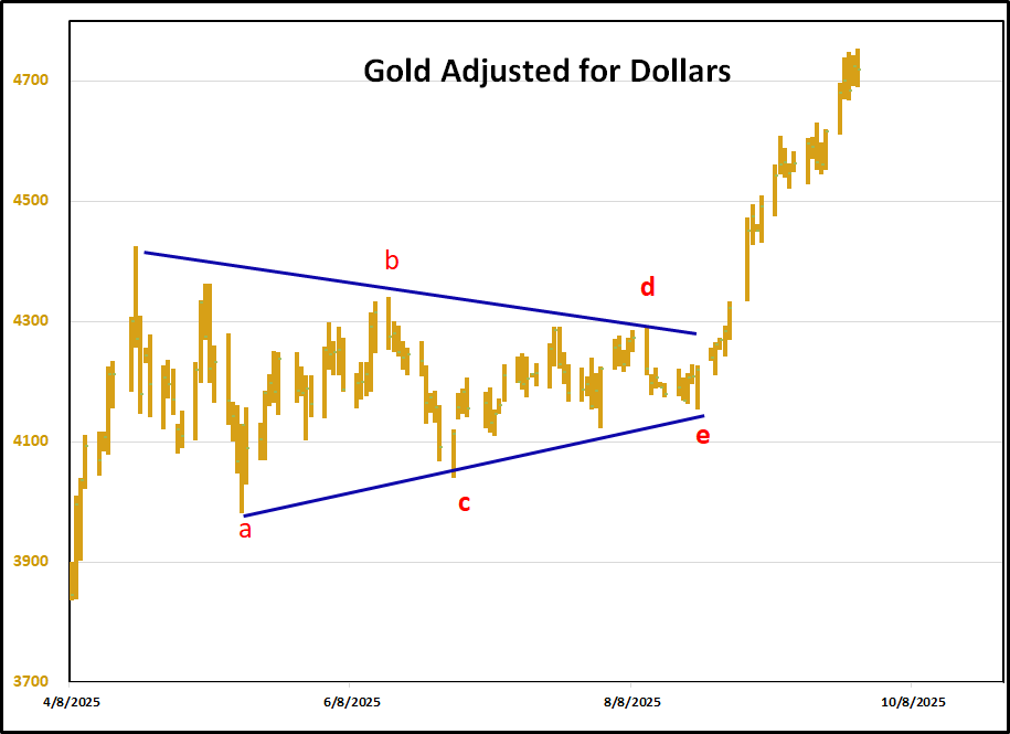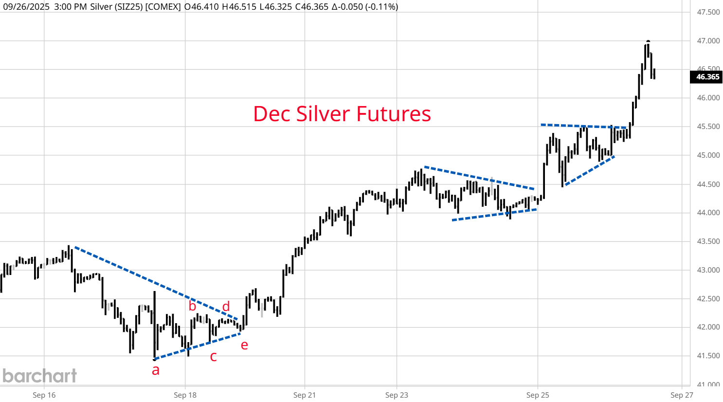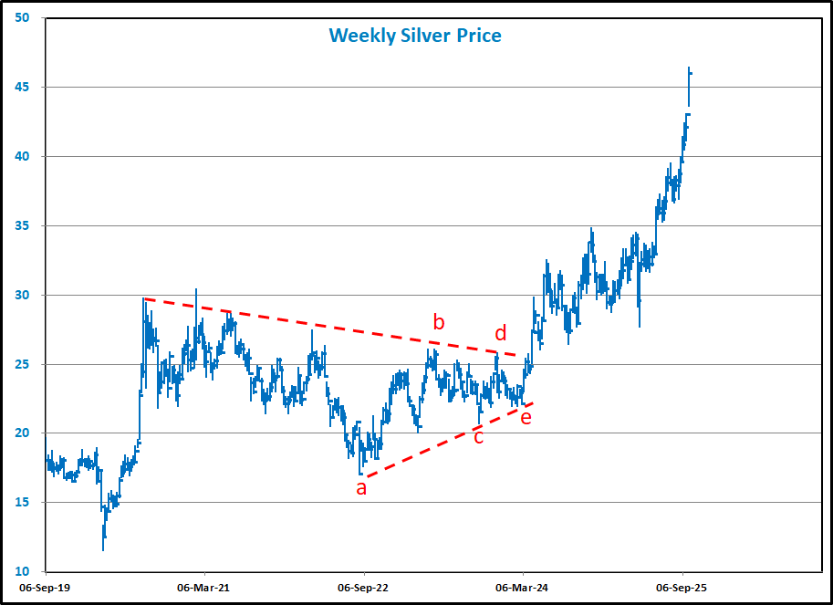 With commodities like gold and silver, it is impossible to predict the ending point of the final burst higher. When most things get more expensive, we buy less and if we own it and see that someone is willing to pay a lot for it, we think of selling. Gold, silver and now our stock market work differently. The higher and more rapid the price gain, the more attractive it becomes to speculators. I worry that some of the following markets are displaying that characteristic now. After the burst higher comes a reversal. Sometimes the price comes back to the zone of the triangle then resumes its advance. Other times, the triangle precedes a major top and for the first time in months or years, "buy the dip" doesn't work.