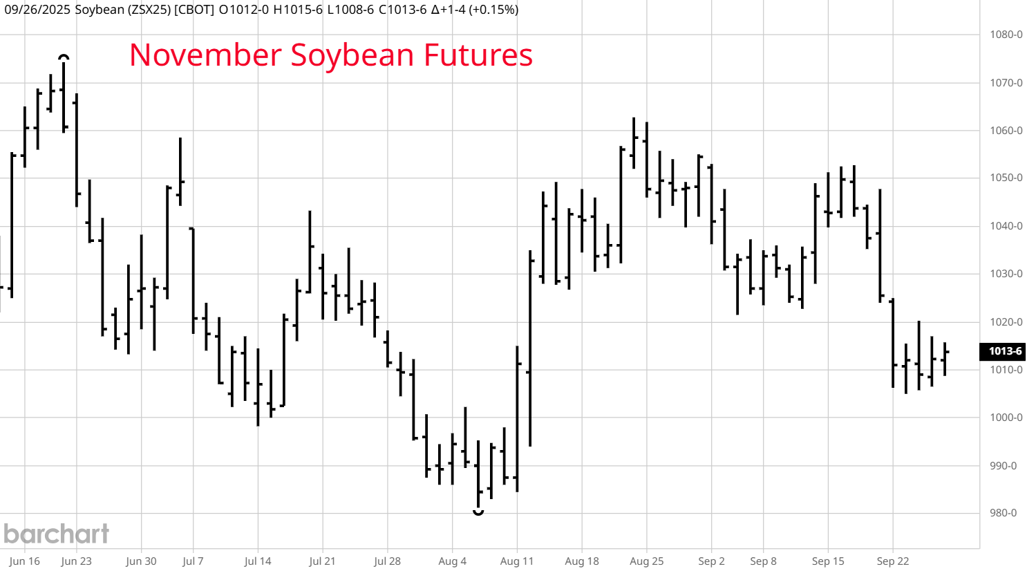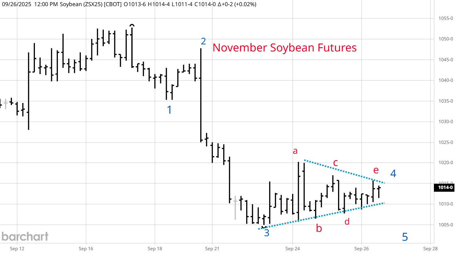 Triangles can also form in a down market. Soybeans might be giving us an example. The left side graph shows the big picture. Bean prices rallied off a low last summer and are giving much of it back. The sell off could be close to finishing. On the right is a close-up of the recent action. The ups and downs look like the triangles shown on the right side of the textbook. If it works out we should be close to a thrust down and reversal to the upside. Early October is often a seasonal low in beans so the timing is appropriate.