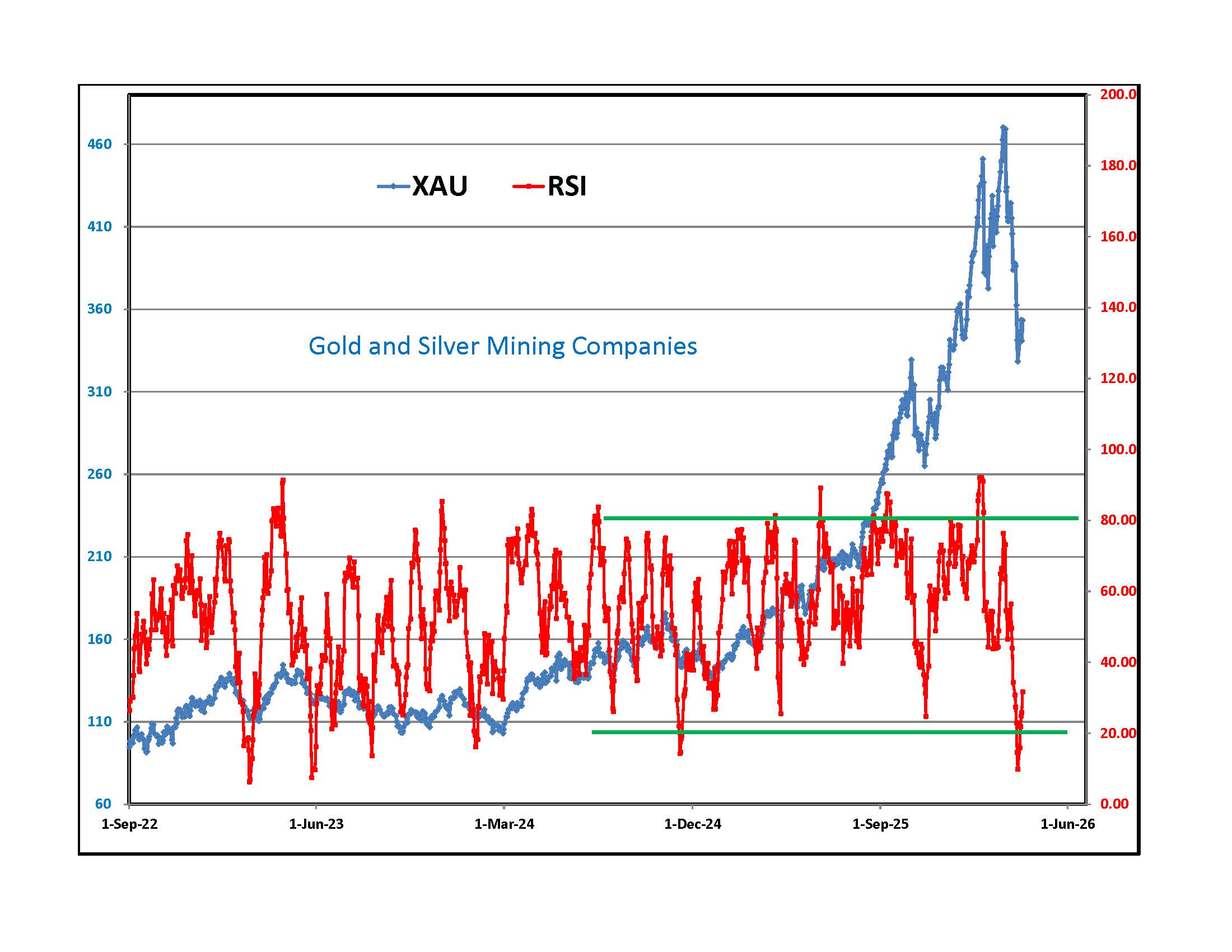 Directly to the left is XAU, an index of gold and silver mining company shares and an RSI oscillator below. Mining shares just suffered a major whipe out In past cycles that saw something similar, prices were higher over the next year almost every time. Some of the previous extremes in the oscillator were followed by slightly lower lows in XAU over the next month before a good rebound.
