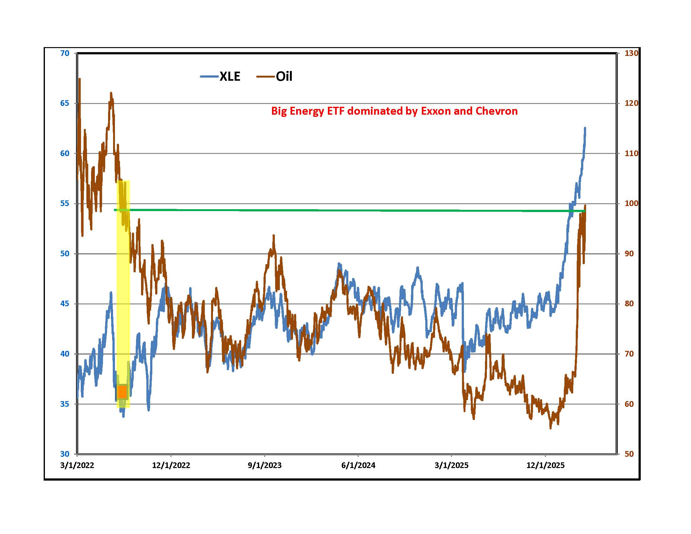 By week's end, the energy sector was the big winner. The left side graph shows XLE, the ETF that includes all the majors. Below is a simple RSI momentum oscillator with yellow rectangles marking previous periods when it was near the top of its range. The first, around the Russian invasion persisted for four months. While the party lasts, everyone is making money, but, a deal to open the Straits would cause a plunge in prices. On the right is a graph of the daily closing price of XLE and WTI Crude Oil. The yellow rectangle marks the value of XLE the last time the nearby futures contract closed a week at around $100. The difference was that traders were pricing in future lower energy complex profits. It marked a low for XLE. Now, they see unlimited profits.