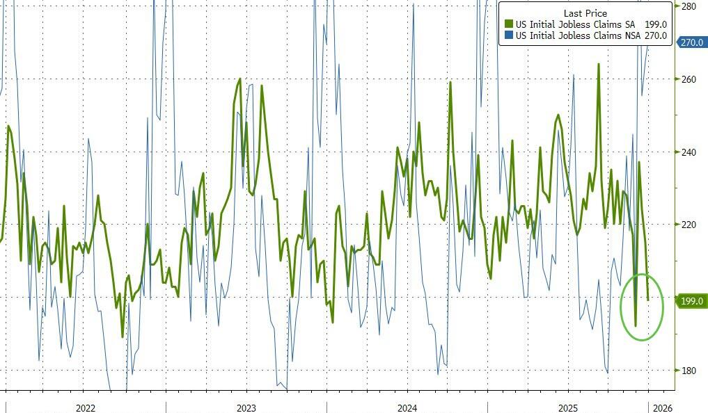 On the left is the latest for New Claims for Unemployment Benefits. The green line is the seasonally adjusted number. The blue line shows the unadjusted data. Analysts pay attention to the seasonally adjusted data. It came in at 199,000, a very low reading. Unadjusted New Claims were 270,000. Continuing Claims (red line, right side graph) fell to 1,866,000. January numbers will better reflect what is going on with jobs.