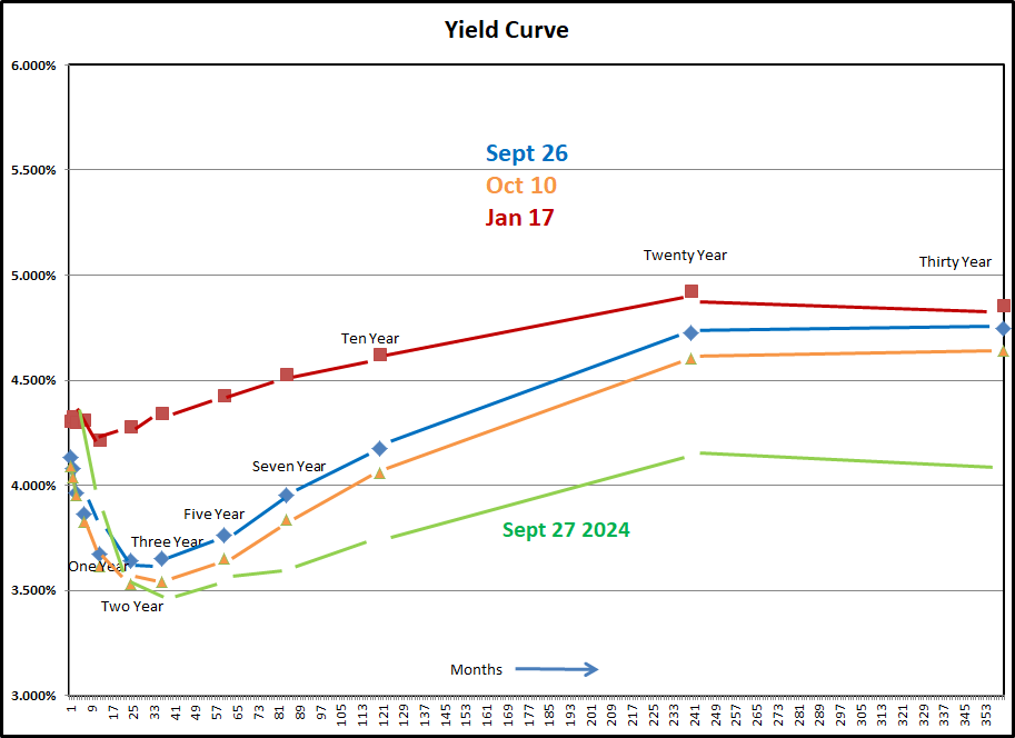 The left side graph shows the yield curve on U.S. government debt. The orange line is the latest with rates falling late in the week as stocks crashed. The right side chart shows the history of rates on the popular 10 year Note. Despite the predictions of lower rates, the graph still looks like a sideways consolidation before another up move in rates.