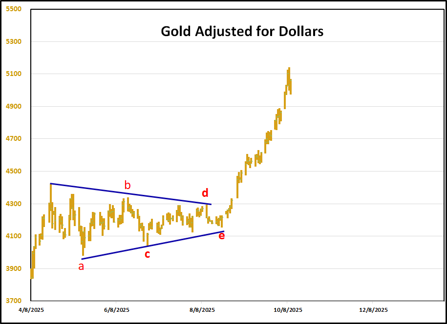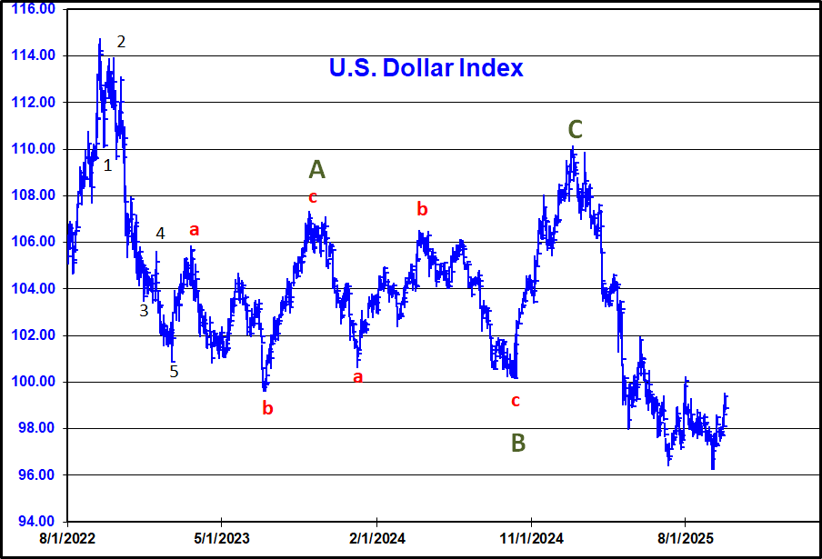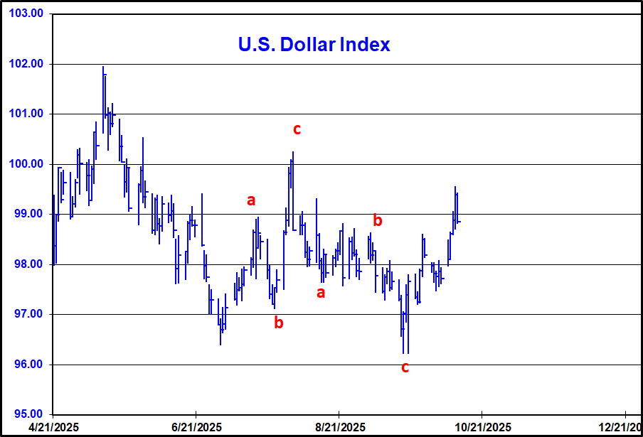 A couple of months ago you couldn't find a single analyst who liked the Dollar. One could make the case that it finished a simple down, sideways, down correction. On the right is the recent action. The two a,b,c sections look more like part of an upward correction than a major bottom. 100 then 102 should be resistance.