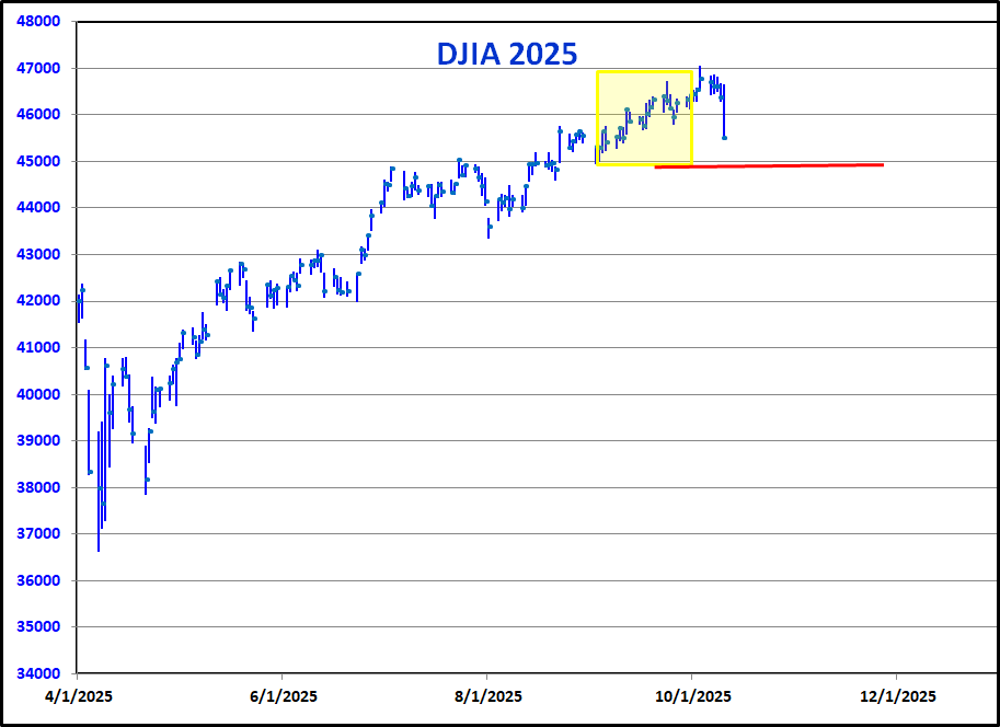 The daily graphs above show the S&P 500 and Dow Jones Industrials from April's lows. The yellow rectangles show the trading during September. A lot of traders are "swing traders" and even if they don't use this discipline as their primary tool, they include its theory in their package of tools. When stocks close below the previous day's trading range they are said to have made a daily swing high which is an early sign of weakness. When they close below the range of the last week of trading they form a weekly swing high which is a more serious sign of a top forming. On Friday, both the S&P 500 and Dow Jones Industrials closed below the previous week. Monthly swing highs are very serious business. If stocks continue to sell off next week and trade below the yellow shaded area they will form monthly swing highs and even non-swing traders will turn bearish. The red arrows on the S&P 500 graph mark theoretical 39 day trading cycle lows as theorized by Cyclesman.com, my favorite market newsletter. On Friday, the S&P 500 closed below the previous cycle low 12 days after the 39 day low. Purists will refer to this as a failed cycle which implies lower prices into the 39 day period which is 27 trading days from now in November.