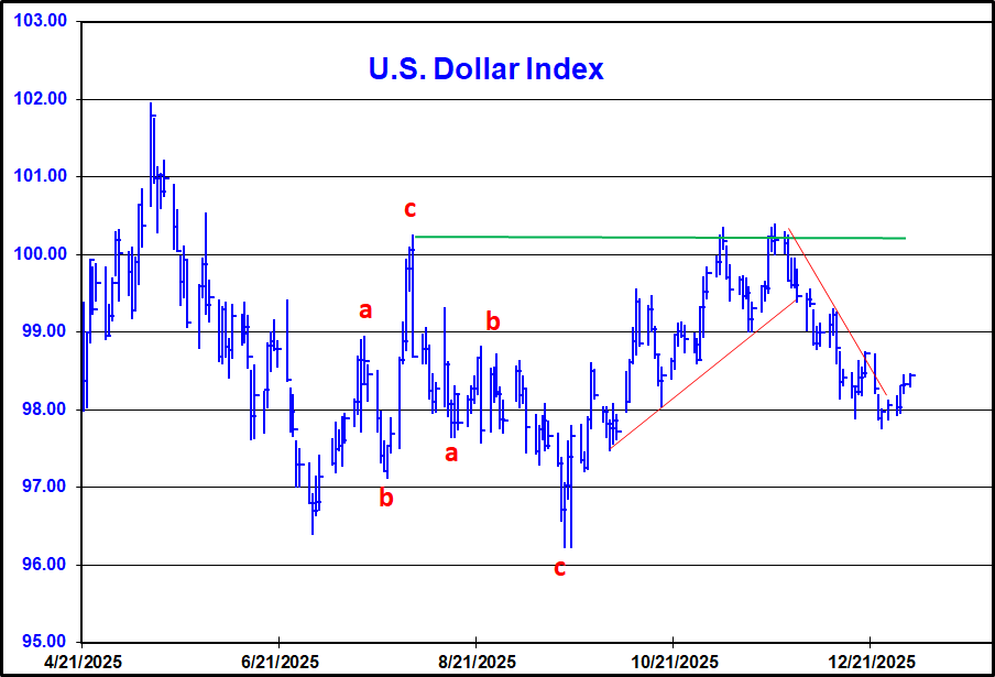 The Dollar refuses to die. The sideways trading range still looks like a correction before another decline but the late December low held well above the fall low. Currency trends often take place at the end of the year. The action in Venezuela should benefit the Dollar. If a Pro-U.S. group replaces Maduro it means work for U.S. companies, more oil supply and less in military expenditures to defend against a hostile actor just a few hours by air from Miami. We need a move above the green horizontal line on the left side graph to feel better about the Dollar.