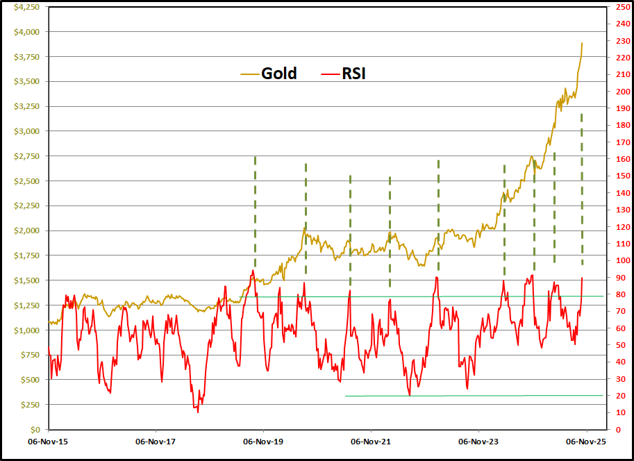 Gold and Silver - I am looking for a top. With the weekly RSI at .90 it is a dangerous time to buy. With everyone highly leveraged through options or leveraged ETFs, losses in one asset class tend to spill over into everything else.