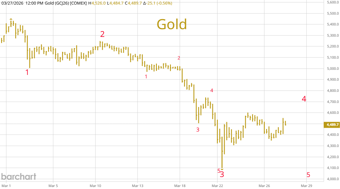 The upper two graphs show the latest steep sell off with two different wave counts. The left side graph sees the sell off as a completed five wave move with a good sized rebound likely. The right side graph sees the low as a third extended wave with an upward wave 4 in progress that will be followed by one more painful sell off. On the lower left is a graph of the daily closing price of gold in NY and a simple RSI oscillator. Gold is in the same place that other markets are. You don't dare sell it short because it is already oversold, but if the war continues and other countries need cash, you know that tons of gold could hit the London market while you are sleeping and you wake up to find the price $500 lower. The bottom right side chart shows the top and sell off. Bulls are hoping that it is a simple zig-zag type correction with each down leg approximately the same length as shown by the red dashed lines.