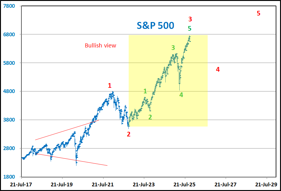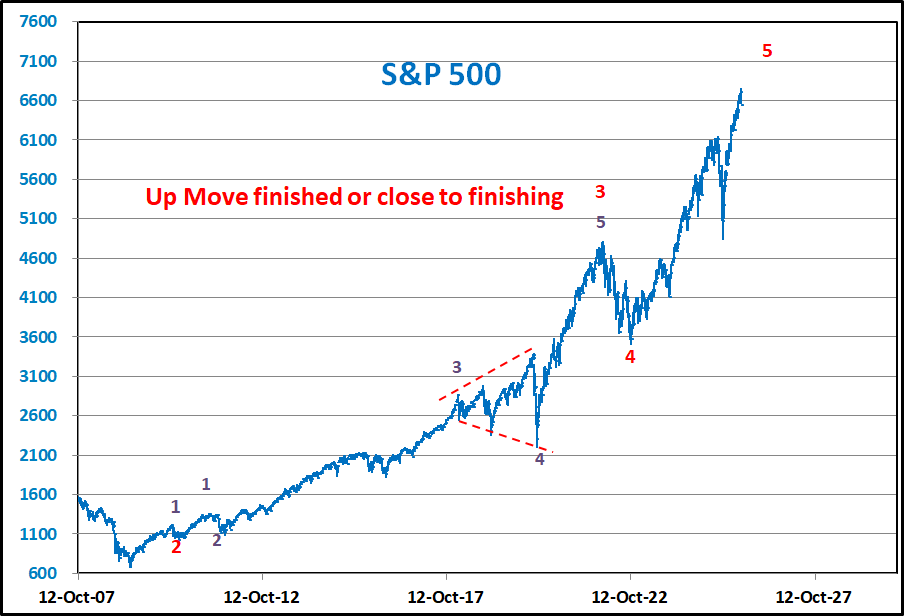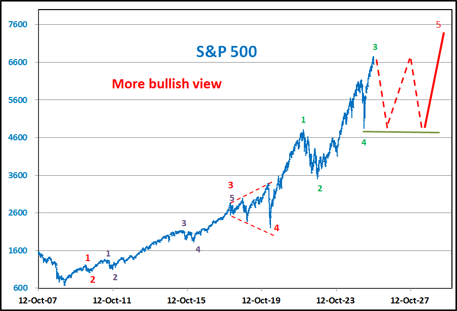Using charts to speculate on longer term future moves is rarely profitable but it is entertaining so why not do it? The S&P 500 is the most widely benchmarked index in the world so I use it. The March 2009 low was the last major low. If you are an Elliott Wave fan you look for a five wave advance. Waves 1,3 and five are up. 2 and four are counter trend moves. One of the waves is usually "extended" and you can count five completed waves within it. The upper left side graph is a very bullish interpretation of the tea leaves. Following red wave 3, stocks traced out an expanding triangle. These patterns usually lead to a final exuberant burst. This one is very extended. We finished or are close to finishing wave 3 of the final move. Wave four could be a "chop 'em up" kind of back and forth thing with a final up move in the next year or two.