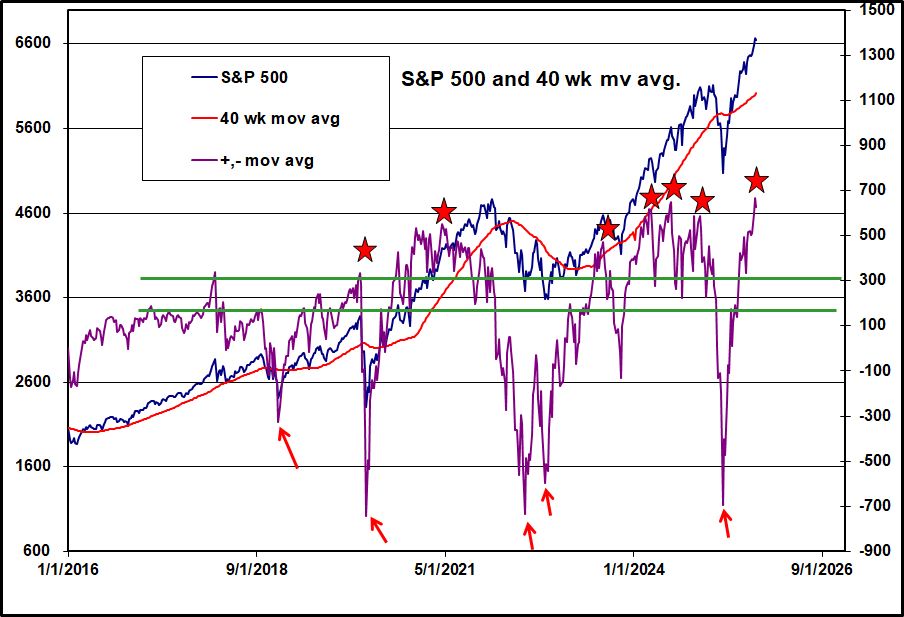 Stocks - The contracting triangle formations are convincing enough to keep me out. Then there is the graph to the right with the purple line showing the difference between the weekly S&P 500 and its one year moving average. Would you want your kids' education fund to be filled with stocks bought at red arrows or red stars?