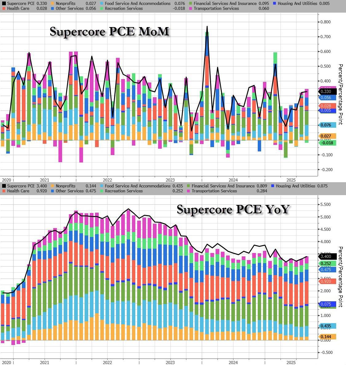 The Super-core (services ex-shelter on the left) rose 0.33% last month and 3.4% annually, a hot number. The component driving the increase was higher fees from money managers who think you are so convinced that your future lies with higher stock prices that you will pay them more to tell you what to buy. If that isn't the sign of a top, I don't know what is. Income and spending (right) came in at 0.4% and 0.6%. Because spending was greater than income, the savings rate fell again.