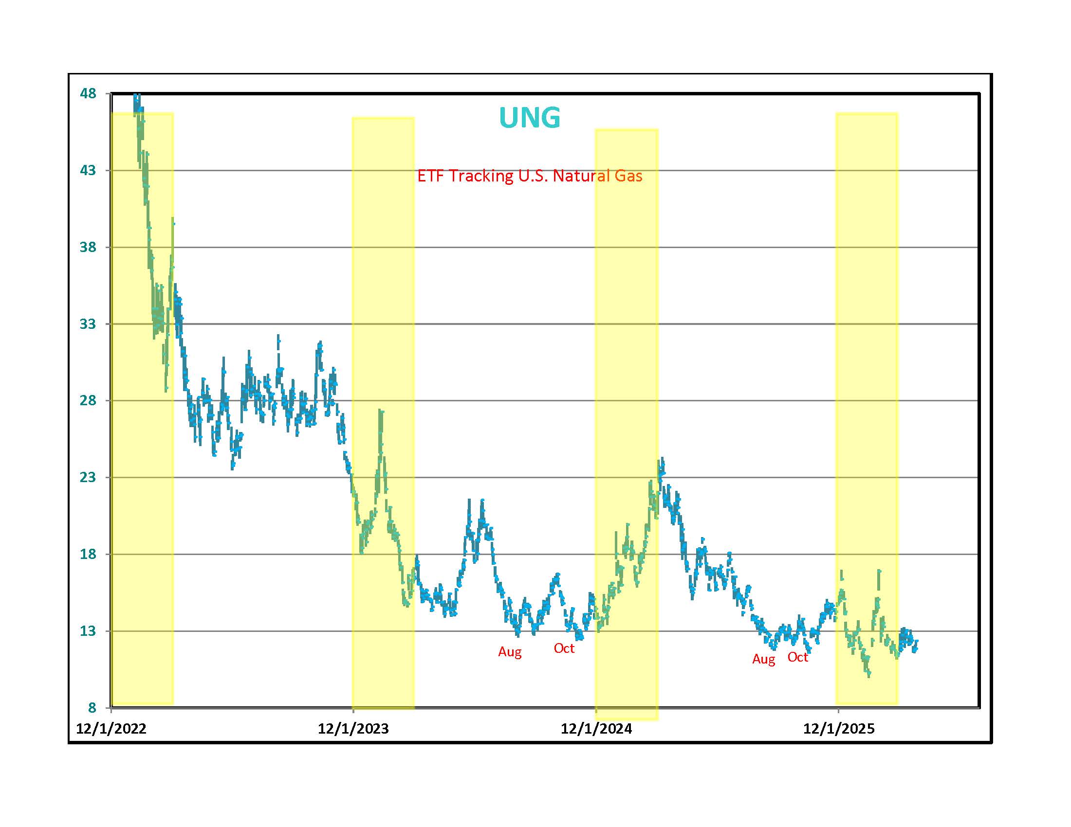 On the lower left is a graph of UNG, an ETF that tracks domestic Natural Gas prices. I put yellow rectangles over winter months when we usually see price increases due to cold weather demand. 20% of the world's Liquefied Natural Gas comes through the Straits and is now unavailable. Qatar is the biggest supplier and due to attacks on its LNG plants, even if the war ended today, 17% of its capacity will be off line for three to five years. Why aren't U.S. Natural Gas prices higher? Because there is a huge surplus of Natural Gas in the United States. Natural Gas has to be cooled into liquid form to ship overseas. The Biden administration halted permits for new plants. President Trump reversed that decision and there are many projects under construction but you can see from the lower right side chart that the big increase in exports is two years away.