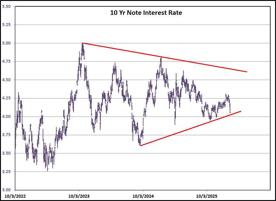 Bonds had a good week as rates dropped a bit across the curve. Investors weighed the inflation evidence and liked what they saw, despite the probability that the energy component of the CPI will be higher next month. There were mixed results on last week's bond auction with a 3 year issue doing well but longer dated maturities not enthusiastically bought. The right side graph shows the path of rates on the world's most tracked debt instrument, the U.S. Ten Year Note. From their high in 2023 rates traded sideways. Mortgages are priced off of the ten year so a continued decline is essential in loosening up the housing market for the spring selling season.
