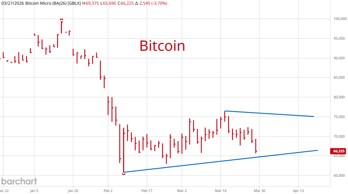 The Dollar Index continued to behave as the red lines suggested, moving back and forth in a wave 4 consolidation before a final up move. Chart perfection requires more sideways action as we go into April. Bitcoin is worth watching because it is due for a cycle low later this year. The sideways action looks more like a correction in a down market than the beginning of another rally phase. I would like to see it trace out a contracting triangle which would set the stage for a final thrust lower.